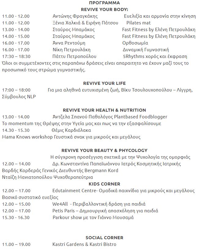 Στο πλαίσιο της εκδήλωσης οι συμμετέχοντες μπορούν να παρακολουθήσουν προγράμματα σωματικής άσκησης (pilates, fast Fithess, ορθοσωμία, δυναμική γυμναστική, χορός και έκφραση) από τους Αντώνη Φραγκάκη, Ξένια Χαλκιά, Νίκη Πετρουλάκη κ.α., καθώς και σεμινάρια ενημερωτικά και βιωματικά με θέματα όπως η υγιεινή διατροφή, η ψυχολογία της ομορφιά κ.α. Ενδιαφέρον παρουσιάζει η δράση cooking workshop όπου μικροί και μεγάλοι θα μάθουν να δημιουργούν απολαυστικά σνακ ευ ζην.