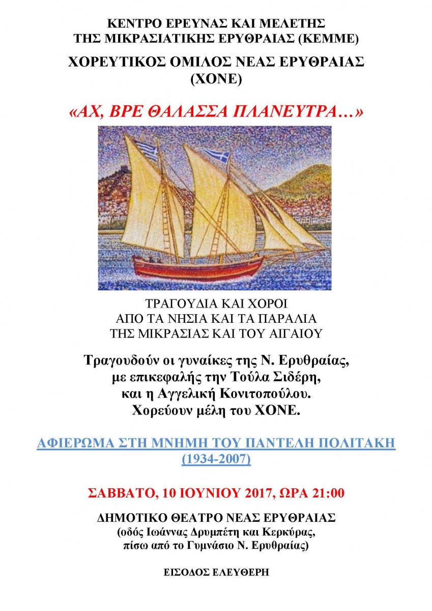 Το ΚΕΜΜΕ και ο Χορευτικός Όμιλος Νέας Ερυθραίας διοργανώνουν μουσικοχορευτική εκδήλωση με τίτλο "Αχ βρε θάλασσα Πλανεύτρα" το Σάββατο 10 Ιουνίου 2017 και ώρα 21.00 στο Δημοτικό Θέατρο Νέας Ερυθραίας.