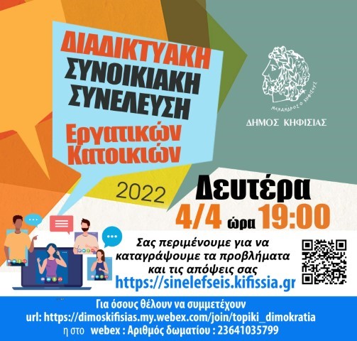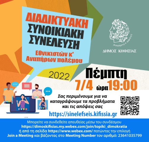 μέσω της εφαρμογής https://sinelefseis.kifissia.gr/ (Αριθμός δωματίου webex 23641035799) ή https://dimoskifisias.my.webex.com/join/topiki_dimokratia