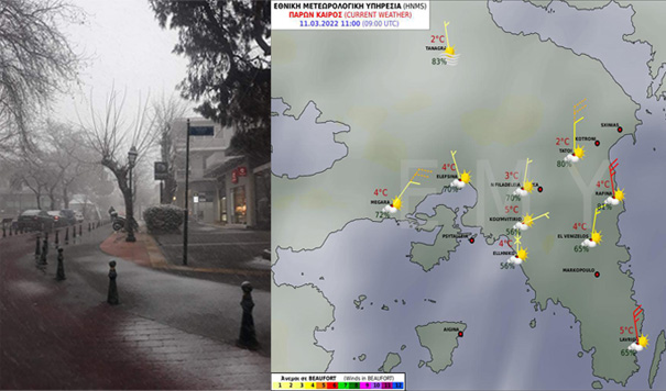 Αύριο Σάββατο (12-03-2022) χιονοπτώσεις κατά τόπους πυκνές αναμένονται από το μεσημέρι στην ανατολική Στερεά (συμπεριλαμβανομένης της Αττικής), την κεντρική και ανατολική Πελοπόννησο και τα ορεινά - ημιορεινά της Κρήτης, ενώ θα χιονίσει και στα νησιά του βορείου και ανατολικού Αιγαίου, τις Κυκλάδες και τα πεδινά της βόρειας Κρήτης.