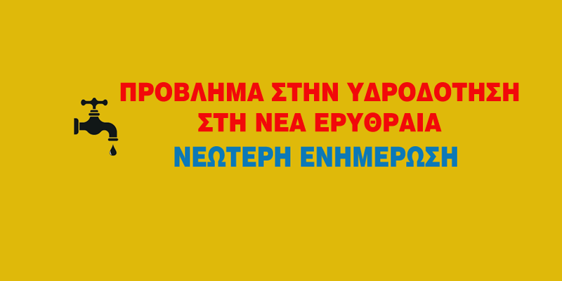 Λόγω σοβαρής βλάβης στο αντλιοστάσιο της Νέας Ερυθραίας, γίνονται προσπάθειες πλήρωσης της δεξαμενής ύδατος. Εξαιτίας αυτού, για το επόμενο χρονικό διάστημα, θα υπάρχουν αυξομειώσεις στην πίεση και παροχή νερού σε όλο το δίκτυο. Παρακαλείστε όπως περιορίσετε την κατανάλωση νερού.
