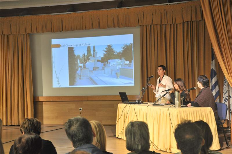 Στη συνεδρία η κα Ρένα Πολίτη παρουσίασε εισήγηση με τίτλο «Δημοτικό Κοιμητήριο Κηφισιάς: γραφική γαλήνη». Στην ξενάγηση και την εισήγηση παρουσιάστηκε η ιστορία του Κοιμητηρίου από την ίδρυσή του το 1890 ως σήμερα. Δόθηκε έμφαση στη χλωρίδα που το καθιστά ένα από τα πιο «πράσινα» κοιμητήρια του λεκανοπεδίου και κυρίως τα χαρακτηριστικά σφαιρικά, γλαυκά κυπαρίσσια της κεντρικής αλέας. Στο κύριο μέρος της εισήγησης παρουσιάστηκε η τυπολογία των ταφικών μνημείων του Κοιμητηρίου, τα είδη των μνημείων και η εξέλιξή τους. Τέλος, παρουσιάστηκαν προτάσεις για τη βέλτιστη διαχείριση του Κοιμητηρίου, την καταγραφή και συντήρηση των ταφικών μνημείων καθώς και την αξιοποίηση του Κοιμητηρίου με σκοπό τη σύνδεση του με τοπόσημα της πόλης και πρόσωπα που συνδέθηκαν με αυτήν. Με αυτό τον τρόπο θα είναι δυνατή η αξιοποίηση των στοιχείων για την έρευνα τη σχετική με την τοπική ιστορία.