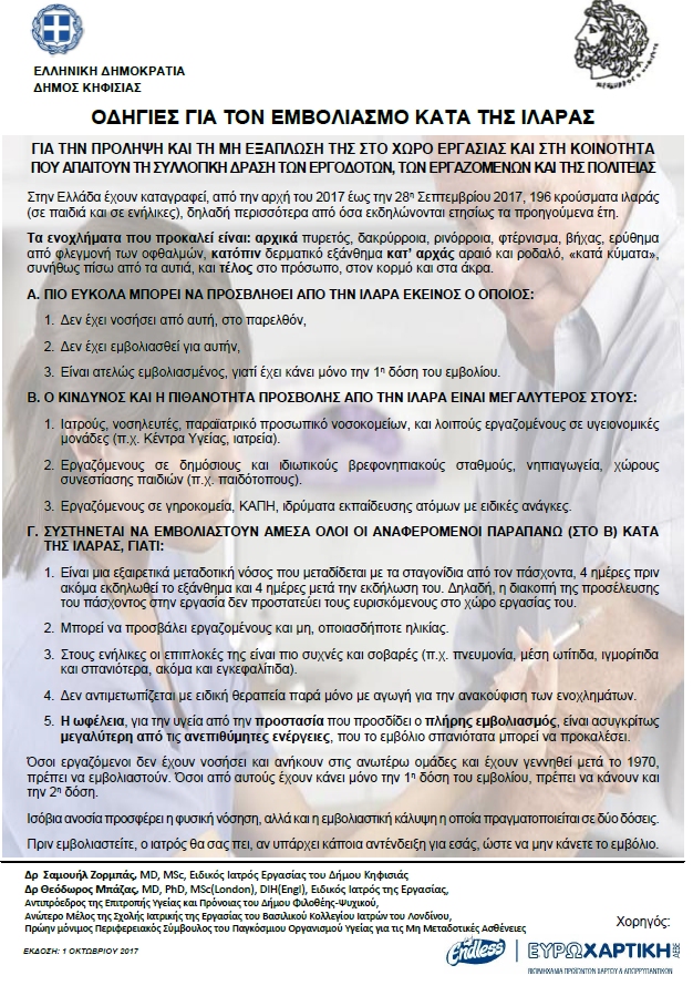 Ο Δήμος Κηφισιάς εκπόνησε και δημοσιοποίησε ευρέως, αφίσα, με οδηγίες για τον εμβολιασμό κατά της ιλαράς με σκοπό την πρόληψη και την μη εξάπλωση της στο χώρο εργασίας και στη κοινότητα, οι οποίες αφορούν τους εργαζόμενους αλλά και τους δημότες που επισκέπτονται τις εγκαταστάσεις του Δήμου. Την επιμέλεια και σύνταξη των οδηγιών της αφίσας είχε ο Σαμουήλ Ζορμπάς, MD, MSc, Ειδικός Ιατρός Εργασίας του Δήμου Κηφισιάς.