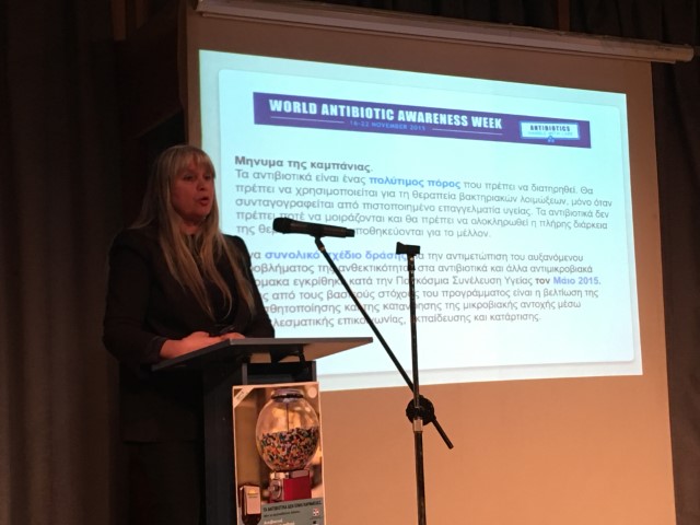 Στη συνέχεια η κα. Νταίζη Παπαθανασοπούλου, Συντονίστρια του Προγράμματος Υγιείς Πόλεις στο Ελληνικό Διαδημοτικό Δίκτυο Υγιών Πόλεων του Π.Ο.Υ., Πρόεδρος της Συμβουλευτικής Επιτροπής του Π.Ο.Υ. Ευρώπης για τα Εθνικά, μετέφερε το χαιρετισμό του Προέδρου του Δικτύου κ. Γιώργου Πατούλη, Περιφερειάρχη Αττικής, αναφέροντας «Ο ρόλος των εκπαιδευτικών είναι καθοριστικός στη διαμόρφωση στάσης ζωής των παιδιών μας σε σχέση με την ορθή χρήση αντιβιοτικών και την απαραίτητη εμβολιαστική τους κάλυψη».
