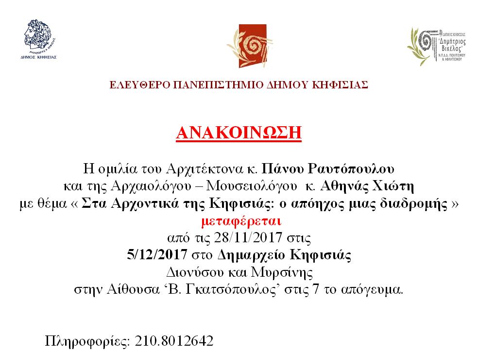 Ομιλία με θέμα «Στα αρχοντικά της Κηφισιάς: ο απόηχος μιας διαδρομής» θα πραγματοποιηθεί την 5/12/ 2017 στις 7 το απόγευμα στην αίθουσα «Δήμαρχος Βασ. Γκατσόπουλος» του δημαρχείου Κηφισιάς (Διονύσου & Μυρσίνης, Κηφισιά).