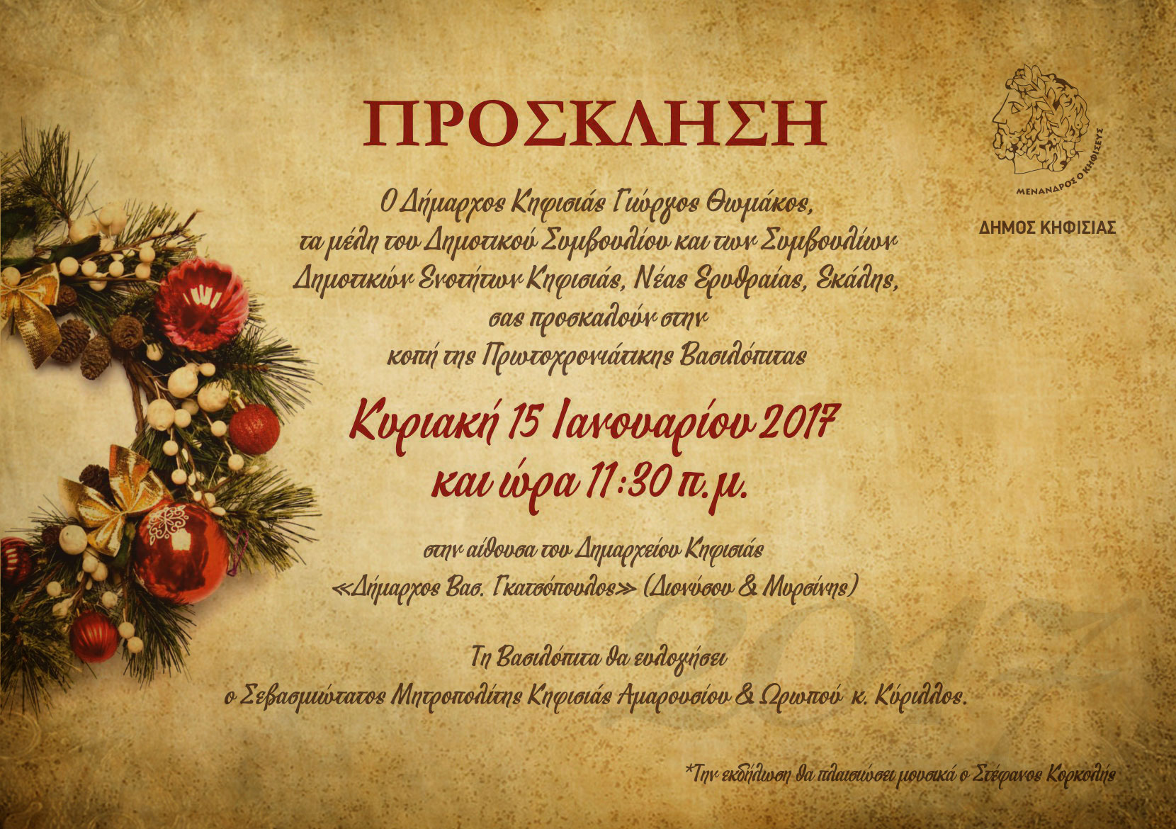 Ο Δήμαρχος Κηφισιάς Γιώργος Θωμάκος, τα μέλη του Δημοτικού Συμβουλίου και των Συμβουλίων Δημοτικών Ενοτήτων Κηφισιάς, Νέας Ερυθραίας και Εκάλης σας προσκαλούν στην κοπή της πρωτοχρονιάτικης βασιλόπιτας 2017, που θα πραγματοποιηθεί την Κυριακή 15 Ιανουαρίου 2017, στις 11:30 π.μ., στην αίθουσα του δημαρχείου Κηφισιάς «Β. Γκατσόπουλος» (Διονύσου και Μυρσίνης).