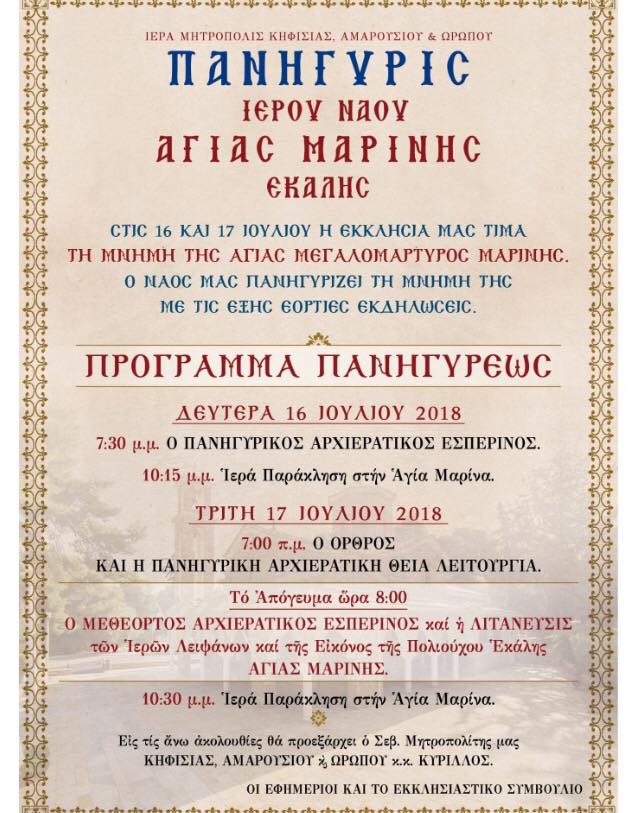 Στον πανηγυρικό Αρχιερατικό Εσπερινό στη Εκκλησία της Αγίας Μαρίνας στην Εκάλη, συμμετέχοντας στις εκδηλώσεις στη μνήμη της Αγίας μεγαλομάρτυρος Μαρίνης, παρευρέθηκε ο Δήμαρχος Κηφισιάς Γιώργος Θωμάκος, μαζί με πλήθος πιστών.