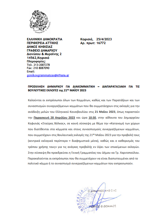 Kαλούνται οι εκπρόσωποι όλων των Κομμάτων, καθώς και των Παρατάξεων και των συνασπισμών συνεργαζόμενων κομμάτων που θα συμμετάσχουν στις εκλογές για την ανάδειξη μελών του Ελληνικού Κοινοβουλίου στις 21 Μαΐου 2023, όπως παραστούν την Παρασκευή 28 Απριλίου 2023 και ώρα 10:30, στην αίθουσα του Δημαρχείου Κηφισιάς «Σταύρος Βόλκος», σε κοινή σύσκεψη με θέμα την «Κατανομή των χώρων που διατίθενται στα κόμματα και στους συνασπισμούς συνεργαζόμενων κομμάτων, που συμμετέχουν στις Βουλευτικές εκλογές της 21ης Μαΐου 2023 για την προβολή τους (κεντρικά εκλογικά περίπτερα – διαφημιστικά μέσα), καθώς και ο καθορισμός του τρόπου χρήσης τους» για τις ανάγκες προβολής εν όψει των επικείμενων εκλογών. Στην σύσκεψη θα προεδρεύσει η Γενική Γραμματέας του Δήμου κα Τρ. Χαριτοπούλου.