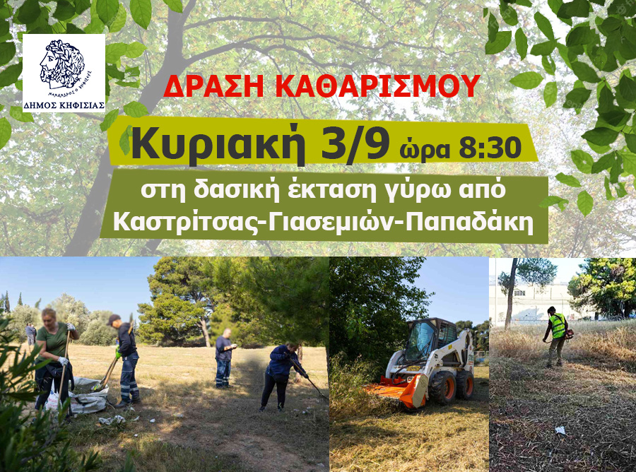 Κυριακή 3/9 και ώρα 8:30. Καθαρισμός της δασικής έκτασης μεταξύ των οδών Καστρίτσας - Γιασεμιών – Παπαδάκη, στο δάσος Φασίδερι.