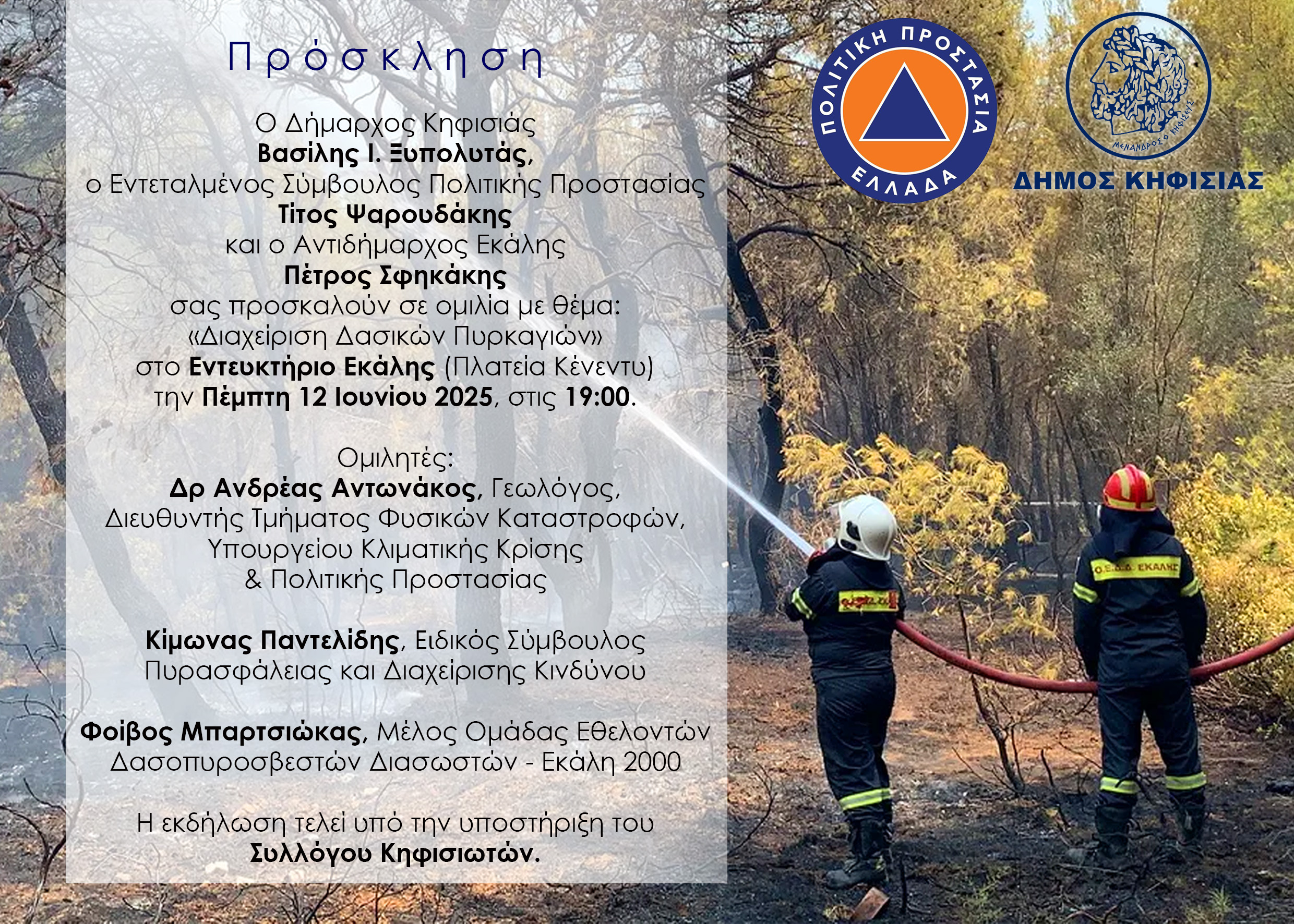 Ο Δήμαρχος Κηφισιάς Βασίλης Ι. Ξυπολυτάς, o Εντεταλμένος Σύμβουλος Πολιτικής Προστασίας Τίτος Ψαρουδάκης και ο Αντιδήμαρχος Εκάλης Πέτρος Σφηκάκης σας προσκαλούν σε ομιλία με θέμα: «Διαχείριση Δασικών Πυρκαγιών» που θα πραγματοποιηθεί την Πέμπτη 12 Ιουνίου 2025, στις 19:00 στο Εντευκτήριο Εκάλης (Πλατεία Κένεντυ).
