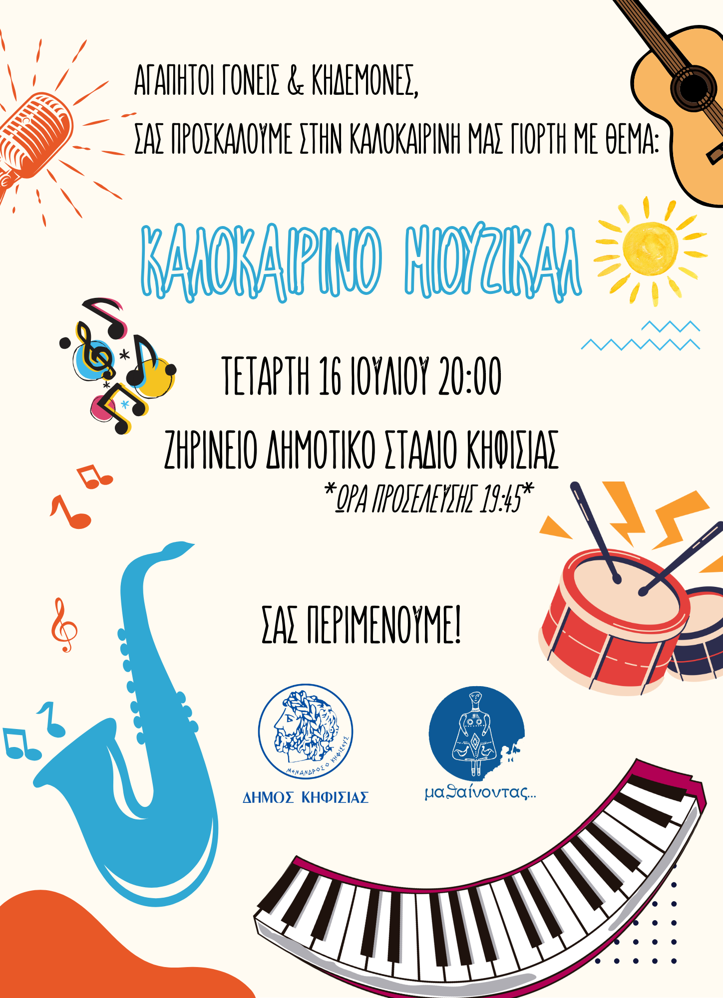 Απόψε, Τετάρτη 16 Ιουλίου σας περιμένουμε όλους γονείς, κηδεμόνες, συγγενείς, μικρούς, αλλά και μεγάλους μας φίλους στο Ζηρίνειο Δημοτικό Στάδιο Κηφισιάς, στις 20.00, να γιορτάσουμε τη λήξη του επιτυχημένου προγράμματος δημιουργικής απασχόλησης του Δήμου Κηφισιάς, για παιδιά 4,5 - 12 ετών "ΚΑΛΟΚΑΙΡΙΝΟΣ ΠΑΙΔΟΤΟΠΟΣ" . Κεντρικό θέμα της γιορτής θα είναι το "Καλοκαιρινό Μιούζικαλ".