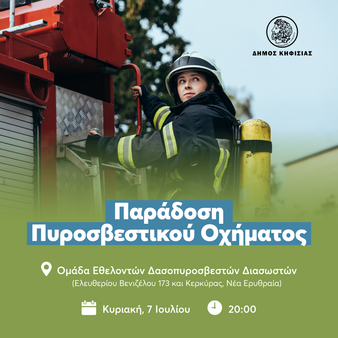 Ο Δήμαρχος Κηφισιάς Βασίλης Ξυπολυτάς σας προσκαλεί στην τελετή παράδοσης - παραλαβής Πυροσβεστικού Οχήματος στην Ομάδα Εθελοντών Δασοπυροσβεστών Διασωστών, που θα πραγματοποιηθεί την Κυριακή 7 Ιουλίου 2024 και ώρα 8 μ.μ., στις εγκαταστάσεις της Ο.Ε.Δ.Δ. στη Νέα Ερυθραία, Ελευθερίου Βενιζέλου 173 & Κερκύρας (είσοδος από οδό Κερκύρας).