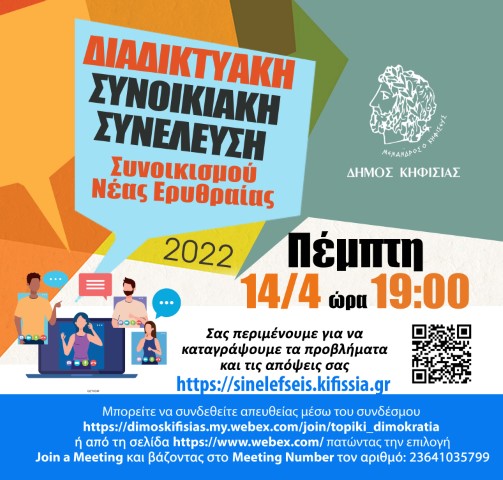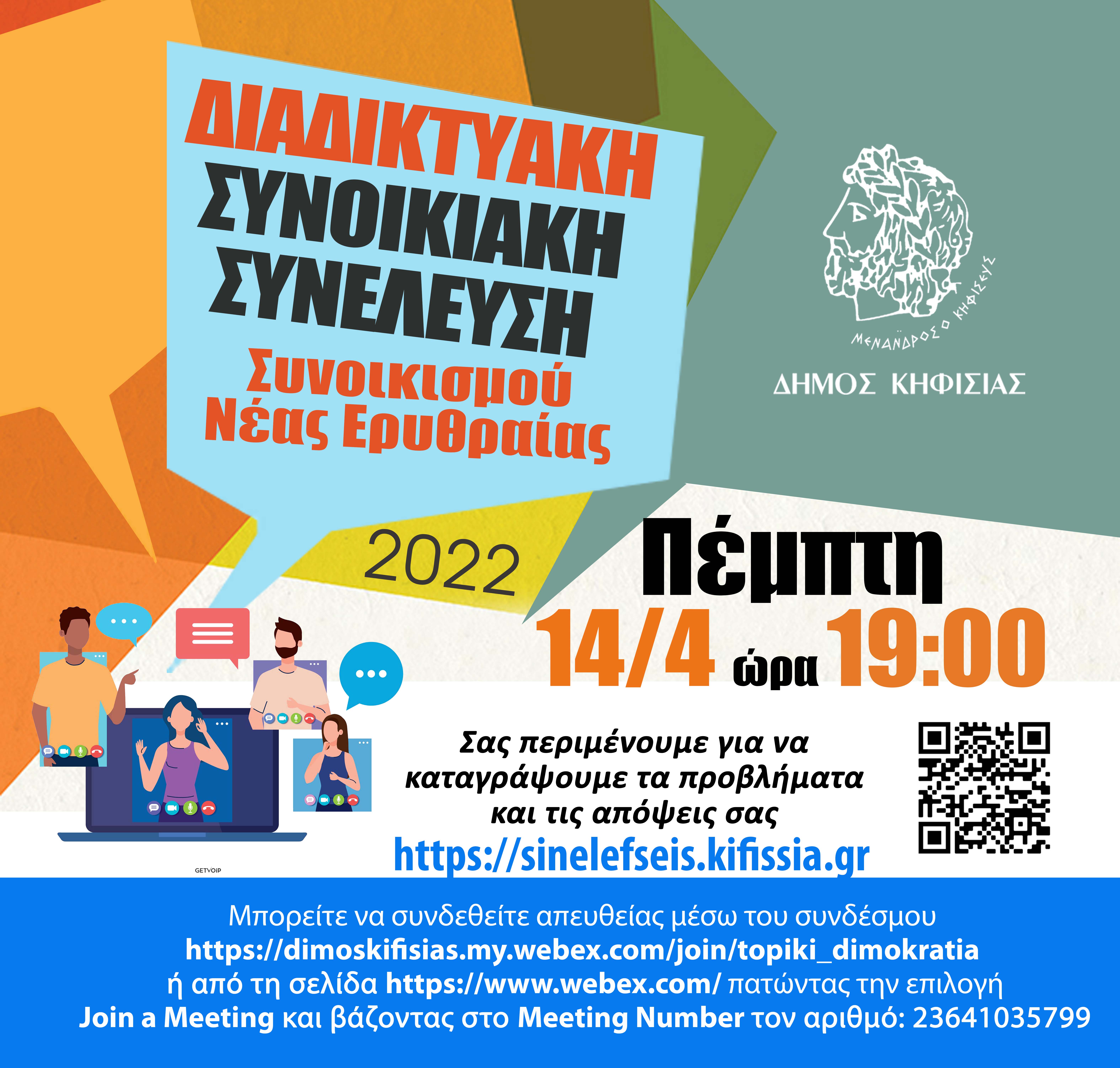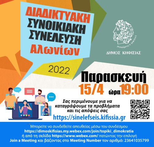 μέσω της εφαρμογής https://sinelefseis.kifissia.gr/ (Αριθμός δωματίου webex 23641035799) ή https://dimoskifisias.my.webex.com/join/topiki_dimokratia