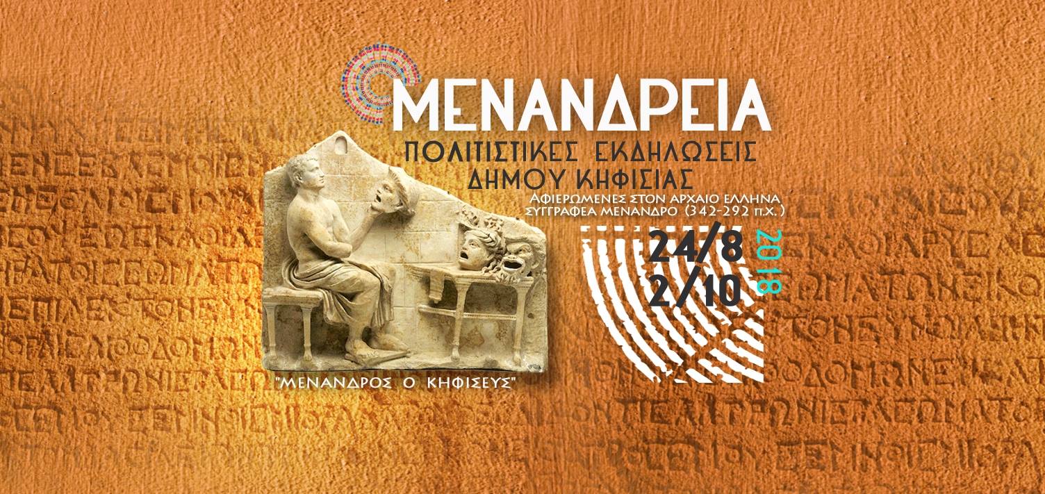 Πλούσιο είναι το πολιτιστικό πρόγραμμα των Μενανδρείων 2018 με πλήθος μουσικών και θεατρικών εκδηλώσεων έως και τις 2 Οκτωβρίου. Ένας μήνας γεμάτος πολιτιστικές εκδηλώσεις, αφιερωμένες στο σημαντικό συγγραφέα Μένανδρο, με καταγωγή από την Κηφισιά. Η φετινή διοργάνωση έχει και ανθρωπιστικό χαρακτήρα, καθώς το σύνολο των εσόδων από τις εκδηλώσεις θα διατεθούν υπέρ των πυρόπληκτων.