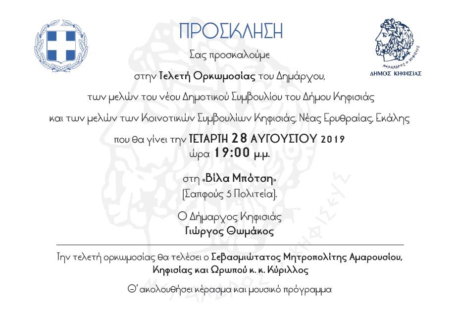Στην ανακαινισμένη «Βίλα Μπότση» (Σαπφούς 5 Πολιτεία) θα πραγματοποιηθεί την Τετάρτη 28 Αυγούστου 2019 και ώρα 19.00 η Τελετή Ορκωμοσίας του Δημάρχου, των μελών του νέου Δημοτικού Συμβουλίου του Δήμου Κηφισιάς και των μελών των Κοινοτικών Συμβουλίων Κηφισιάς, Νέας Ερυθραίας, Εκάλης. Την τελετή ορκωμοσίας θα τελέσει ο Σεβασμιώτατος Μητροπολίτης Αμαρουσίου, Κηφισιάς και Ωρωπού κ. Κύριλλος. Θα ακολουθήσει κέρασμα και μουσικό πρόγραμμα.