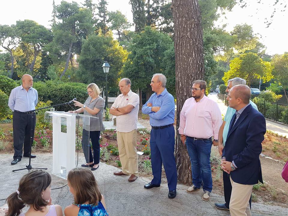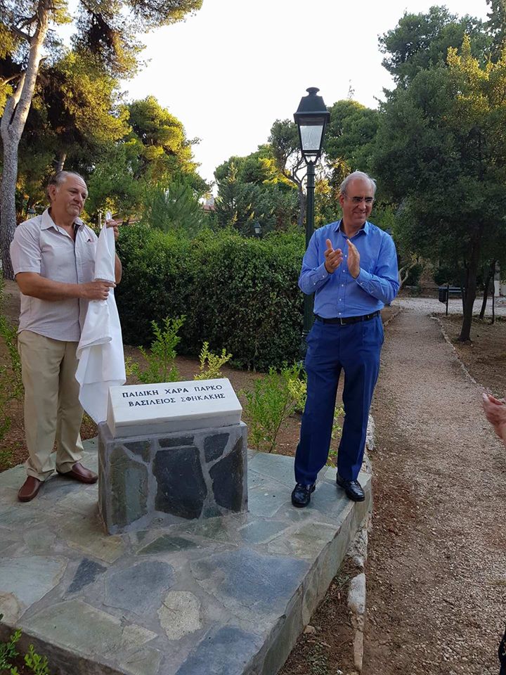 Ακολούθως ο Δήμαρχος Κηφισιάς Γιώργος Θωμάκος και ο Αντιδήμαρχος Δημήτρης Λιανός προχώρησαν στα αποκαλυπτήρια της μαρμάρινης επιγραφής με το όνομα του Βασίλη Σφηκάκη.