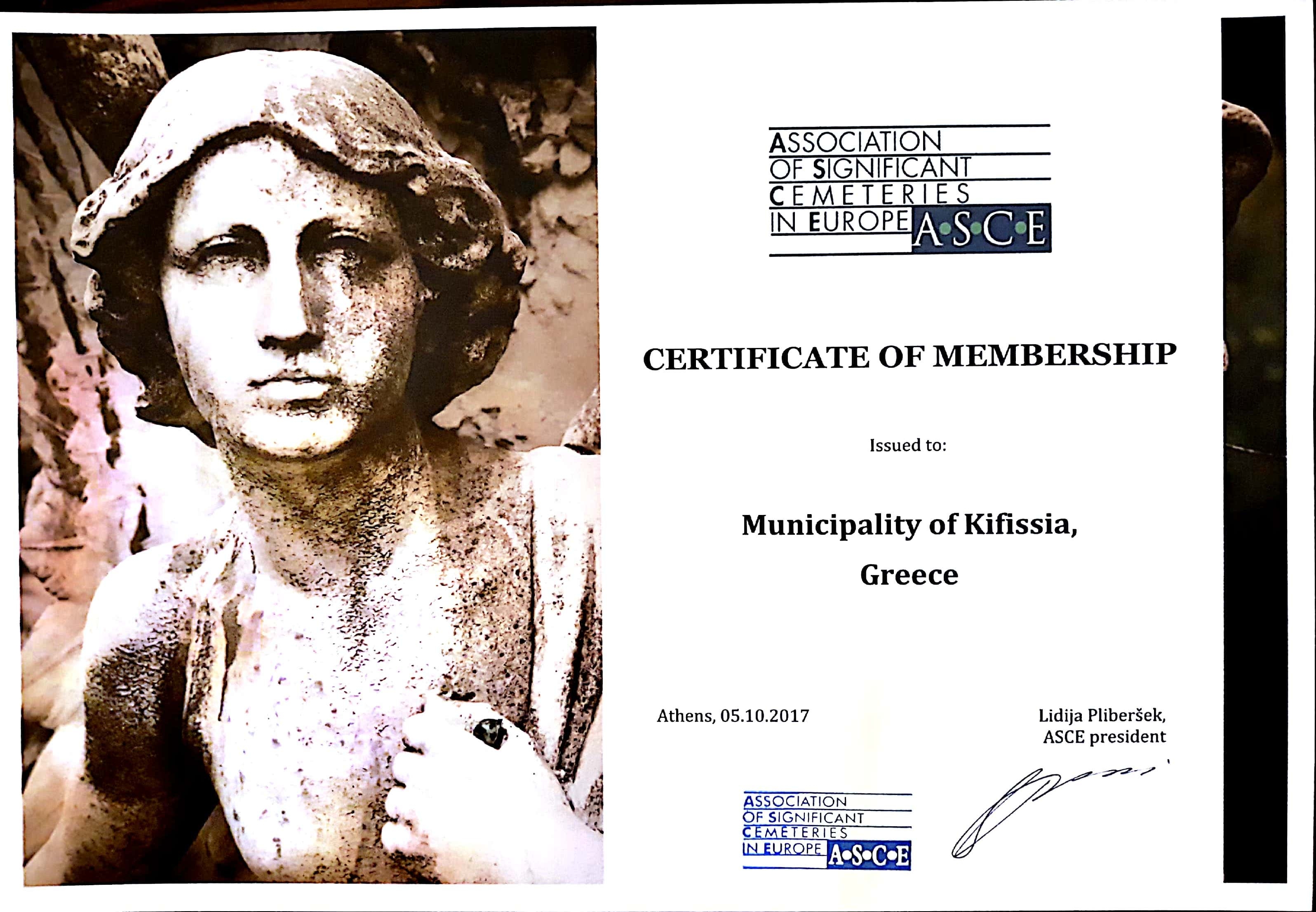 Το Κοιμητήριο Κηφισιάς εντάχθηκε στα Σημαντικά Κοιμητήρια στην Ευρώπη (Association of Significant Cemeteries of Europe), στο πλαίσιο του ετήσιου συνεδρίου της ΑSCE, την Πέμπτη 5 Οκτωβρίου 2017. Τον Δήμο Κηφισιάς εκπροσώπησαν ο αρχιτέκτων και δημοτικός σύμβουλος κ Πάνος Ραυτόπουλος και η υπεύθυνη για το Κοιμητήριο, πρόεδρος της Δ.Ε. Κηφισιάς, κα Ρένα Πολίτη.