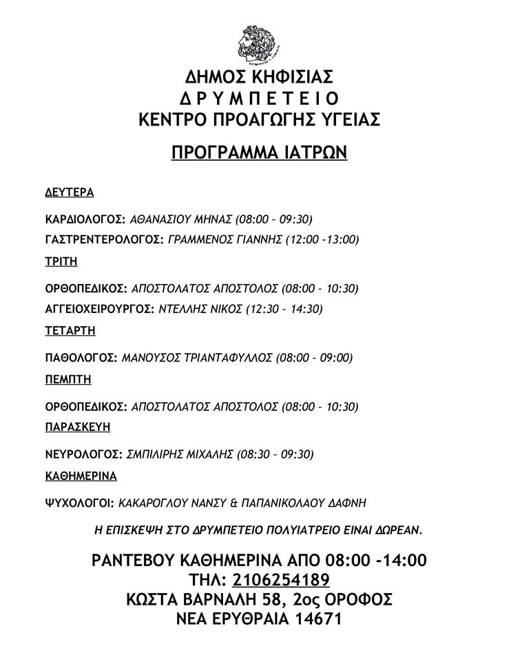 Το πρόγραμμα του Δρυμπέτειου Πολυιατρείου του Δήμου Κηφισιάς