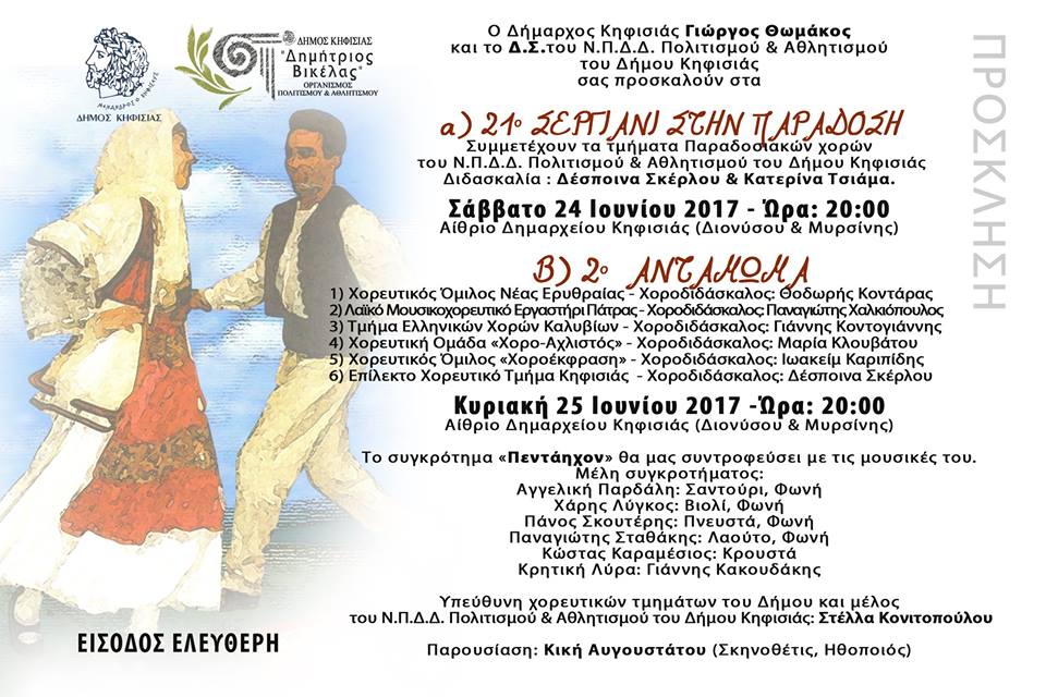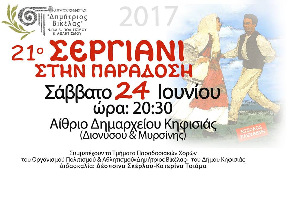 Το 21ο Σεργιάνι στην Παράδοση του Δήμου Κηφισιάς, το οποίο διοργανώνει ο Οργανισμός Πολιτισμού & Αθλητισμού «Δημήτριος Βικέλας», θα πραγματοποιηθεί το Σάββατο 24 Ιουνίου 2017, στις 20:30, στο αίθριο του δημαρχείου Κηφισιάς (Διονύσου & Μυρσίνης).