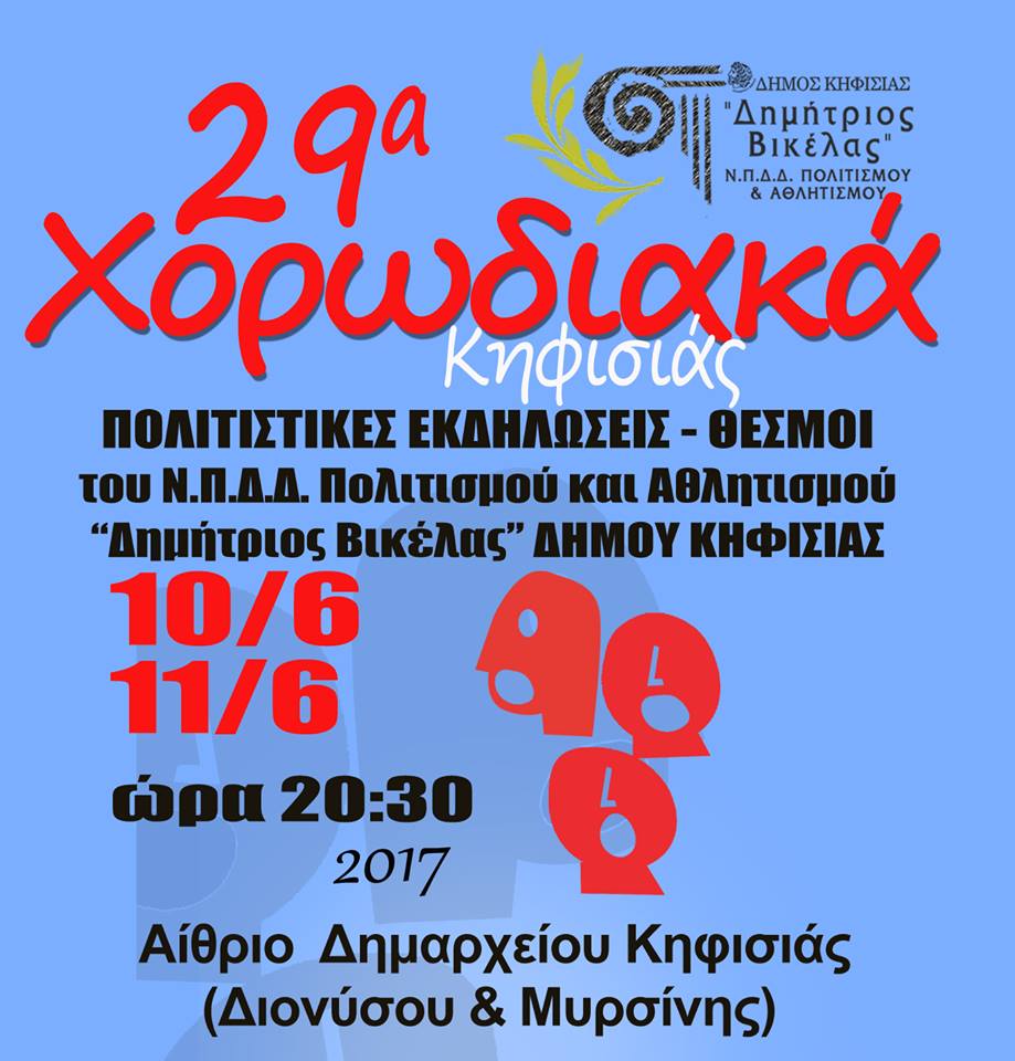 Ο Δήμαρχος Κηφισιάς Γιώργος Θωμάκος και το Ν.Π.Δ.Δ. Πολιτισμού & Αθλητισμού χαιρετίζουν τα 29α Χορωδιακά του Δήμου μας, τα οποία θα λάβουν χώρα το Σάββατο 10 και την Κυριακή 11 Ιουνίου 2017 και ώρα: 20:30, στο Αίθριο Δημαρχείου Κηφισιάς (Διονύσου & Μυρσίνης).