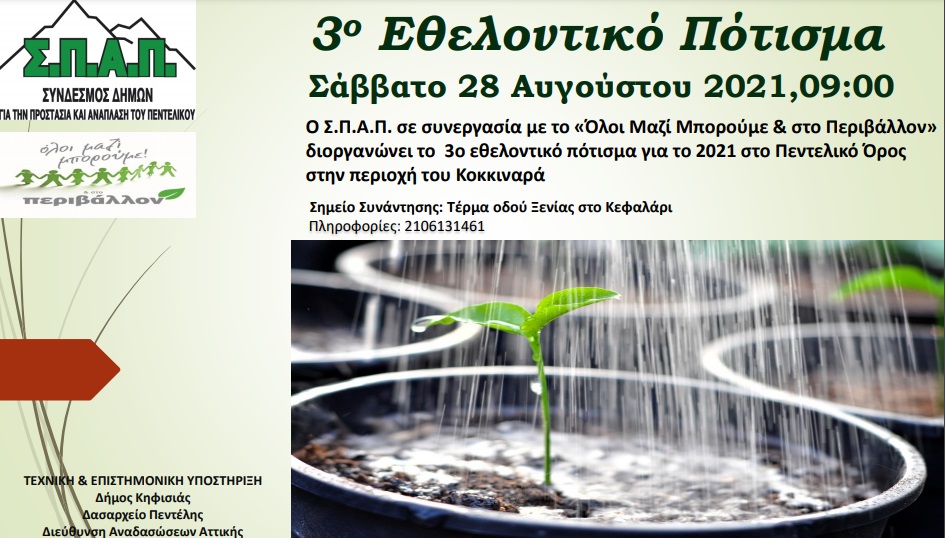 Ο Σύνδεσμος Δήμων για την Προστασία και Ανάπλαση του Πεντελικού (ΣΠΑΠ) συνεχίζοντας την προσπάθεια για την όσο το δυνατόν καλύτερη αποκατάσταση του περιβάλλοντος, διοργανώνει το 3ο Εθελοντικό Πότισμα για το 2021