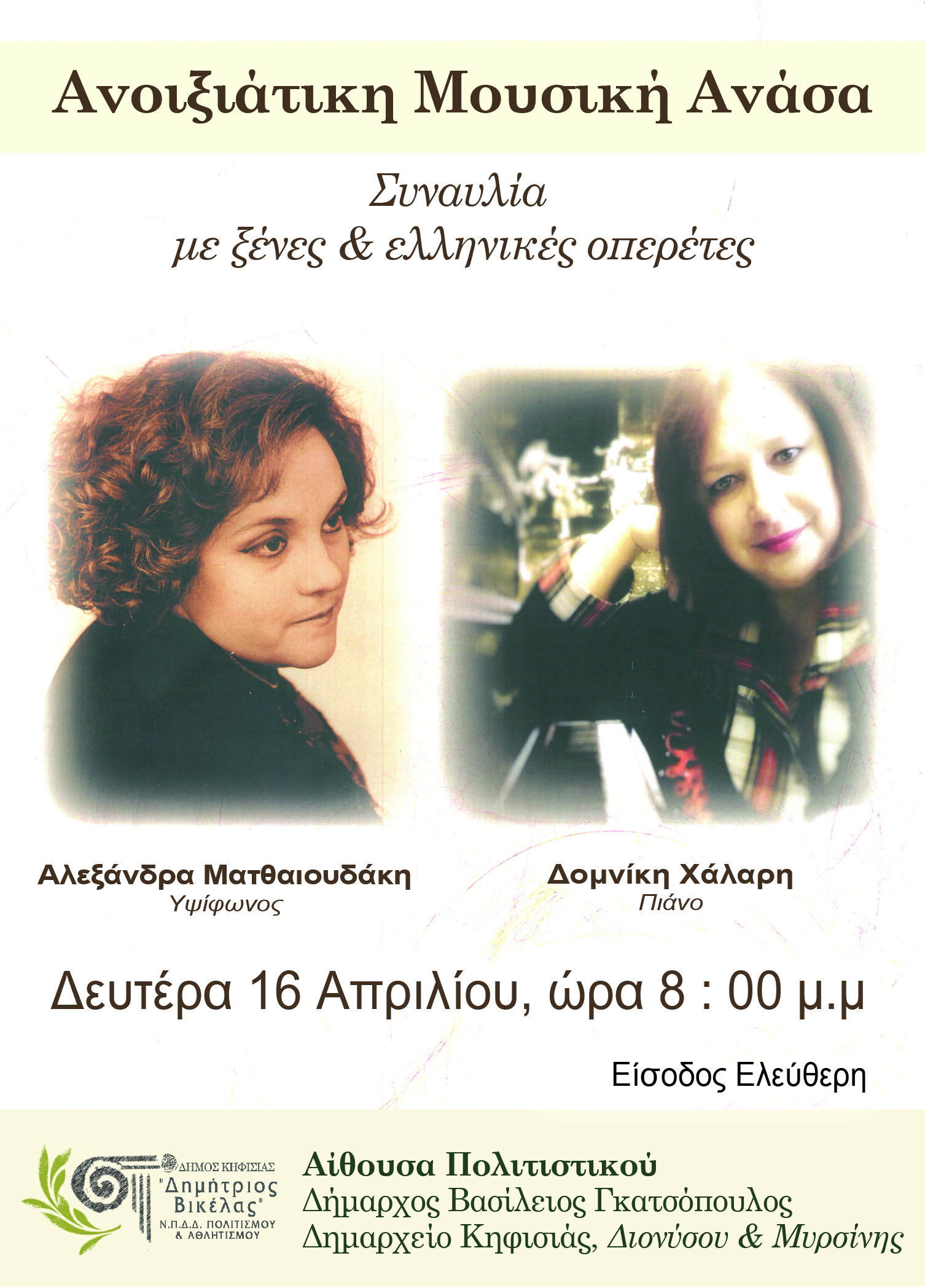 Το Ν.Π.Δ.Δ. Πολιτισμού και Αθλητισμού Δήμου Κηφισιάς «Δ.Βικέλας» σας προσκαλεί σε μουσική εκδήλωση με αγαπημένες μελωδίες από ξένες και ελληνικές οπερέτες, με θέμα «Ανοιξιάτικη Μουσική Ανάσα».