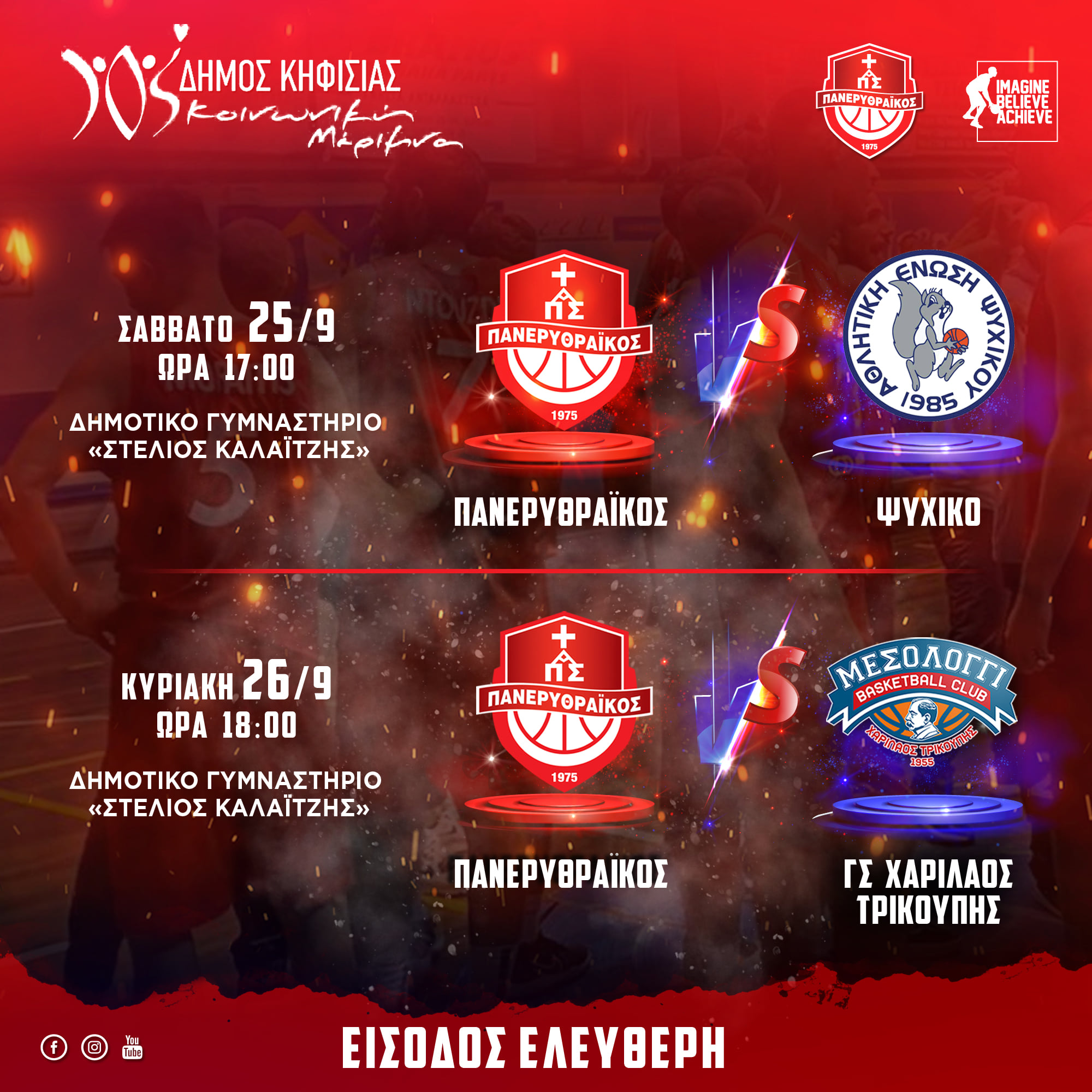 Φιλανθρωπικό χαρακτήρα έχουν οι φιλικοί αγώνες του Πανερυθραϊκού- Μπάσκετ το Σαββατοκύριακο. (25-26 Σεπτεμβρίου). Οι φίλαθλοι θα μπορούν να προσφέρουν είδη πρώτης ανάγκης και τρόφιμα ενισχύοντας τα Κοινωνικά Παντοπωλεία του Δήμου Κηφισιάς.