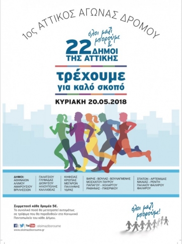 Το ΟΛΟΙ ΜΑΖΙ ΜΠΟΡΟΥΜΕ και 22 Δήμοι της Αττικής διοργανώνουν τον 1ο Αττικό Αγώνα Δρόμου που θα διεξαχθεί την ίδια μέρα και την ίδια ώρα σε όλους τους Δήμους, την Κυριακή 20 Μαΐου 2018 στις 9 το πρωί ακριβώς .
