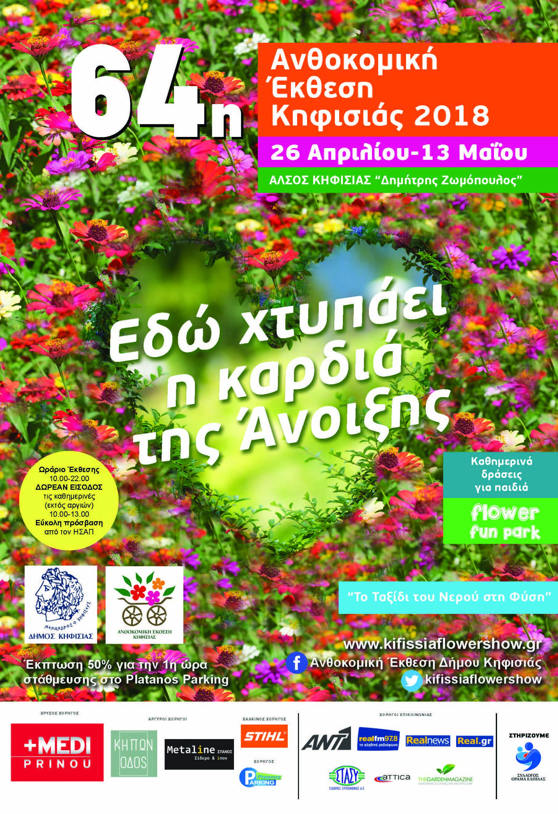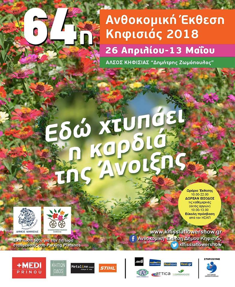 Η 64η Ανθοκομική Έκθεση Κηφισιάς ανοίγει τις πύλες της, στις 26 Απριλίου και θα διαρκέσει μέχρι τις 13 Μαΐου 2018. Tα εγκαίνια της έκθεσης θα πραγματοποιηθούν την Παρασκευή 27 Απριλίου και ώρα 19:00.