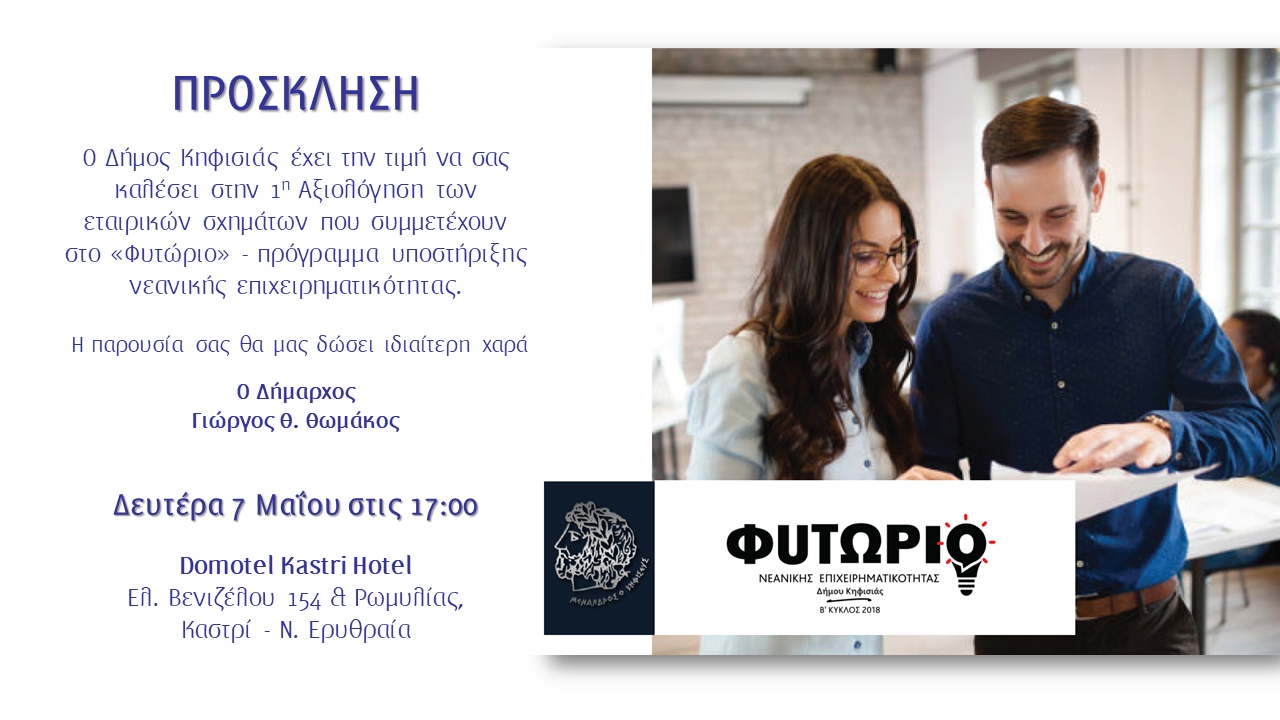 Λόγω της συνεχώς αυξανόμενης συμμετοχής στο πρόγραμμα υποστήριξης νεανικής επιχειρηματικότητας στο Δήμο Κηφισιάς, η υποβολή αιτήσεων συμμετοχής παρατείνεται έως την Πέμπτη 15 Μαρτίου 2018.