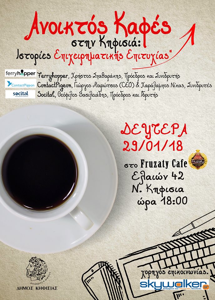 Τη Δευτέρα 29 Ιανουαρίου 2018 πραγματοποιήθηκε με μεγάλη επιτυχία και ενδιαφέρουσες επιχειρηματικές ιστορίες ο Ανοικτός Καφές στην Κηφισιά: Ιστορίες Επιχειρηματικής Επιτυχίας στο Fruzaty Cafe Lunch Bar, στη Νέα Κηφισιά.