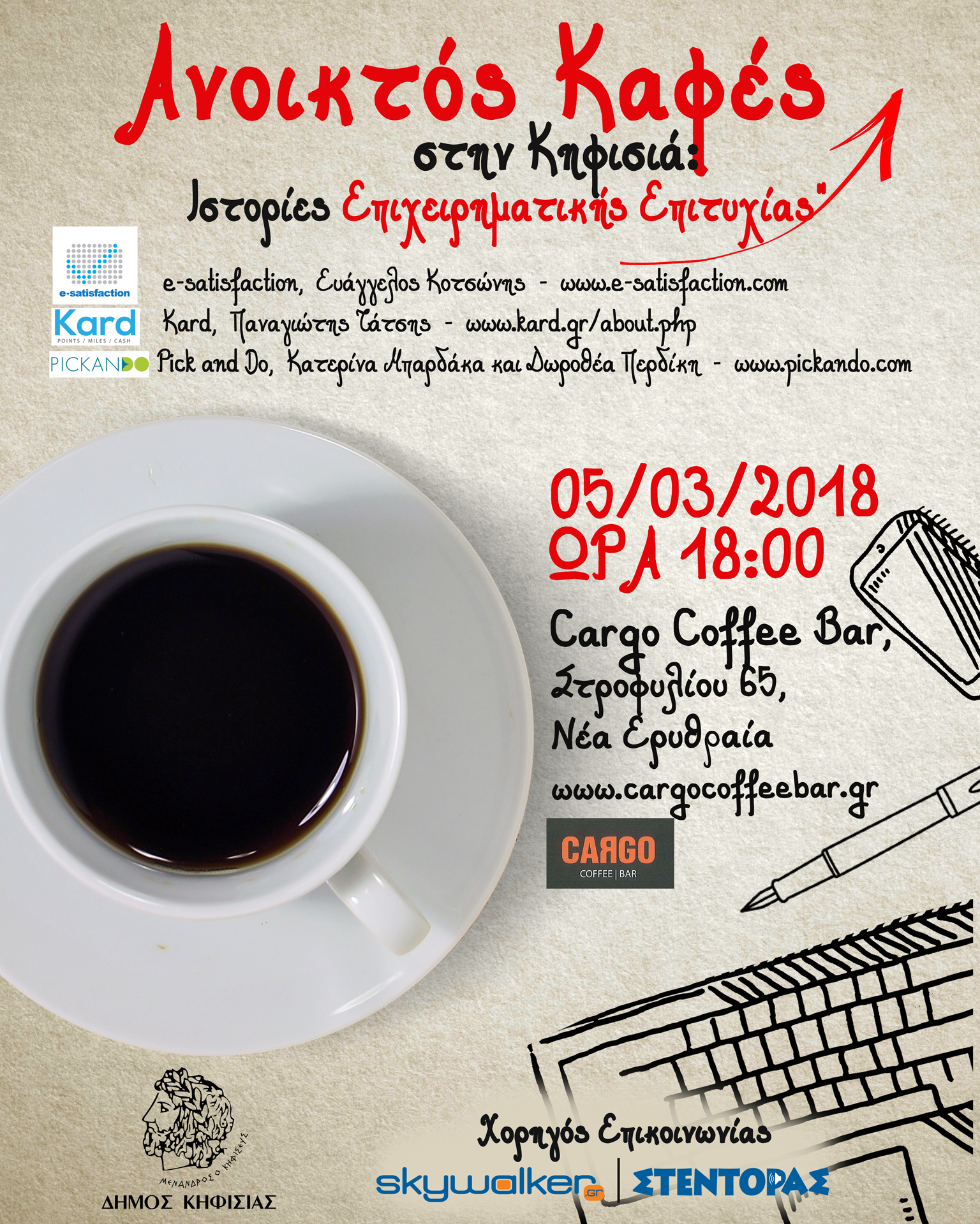 Τη Δευτέρα 5 Μαρτίου στις 6μ.μ. θα πραγματοποιηθεί Ανοικτός Καφές στην Κηφισιά: Ιστορίες Επιχειρηματικής Επιτυχίας, στο Cargo Coffee Bar στη Νέα Ερυθραία.