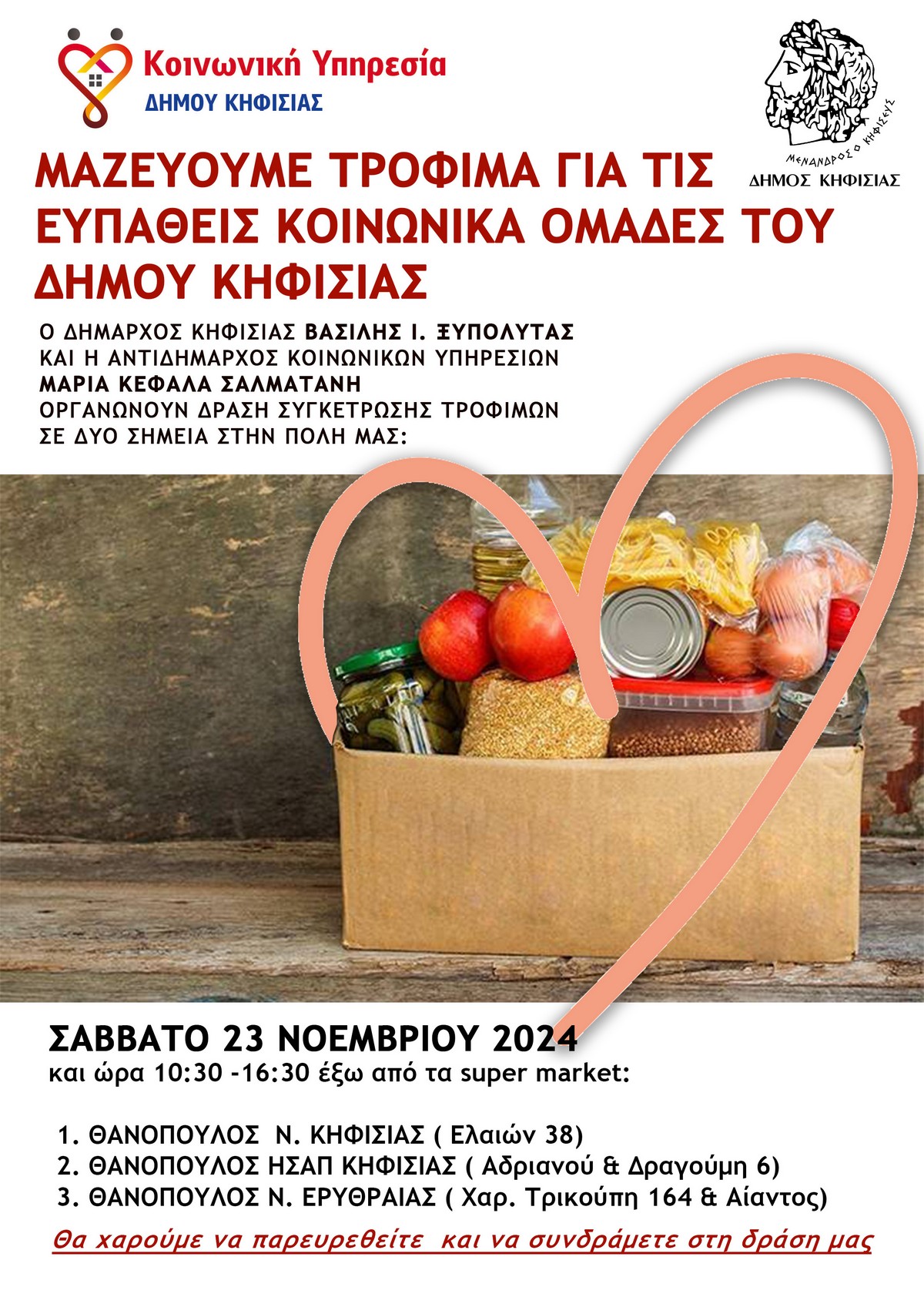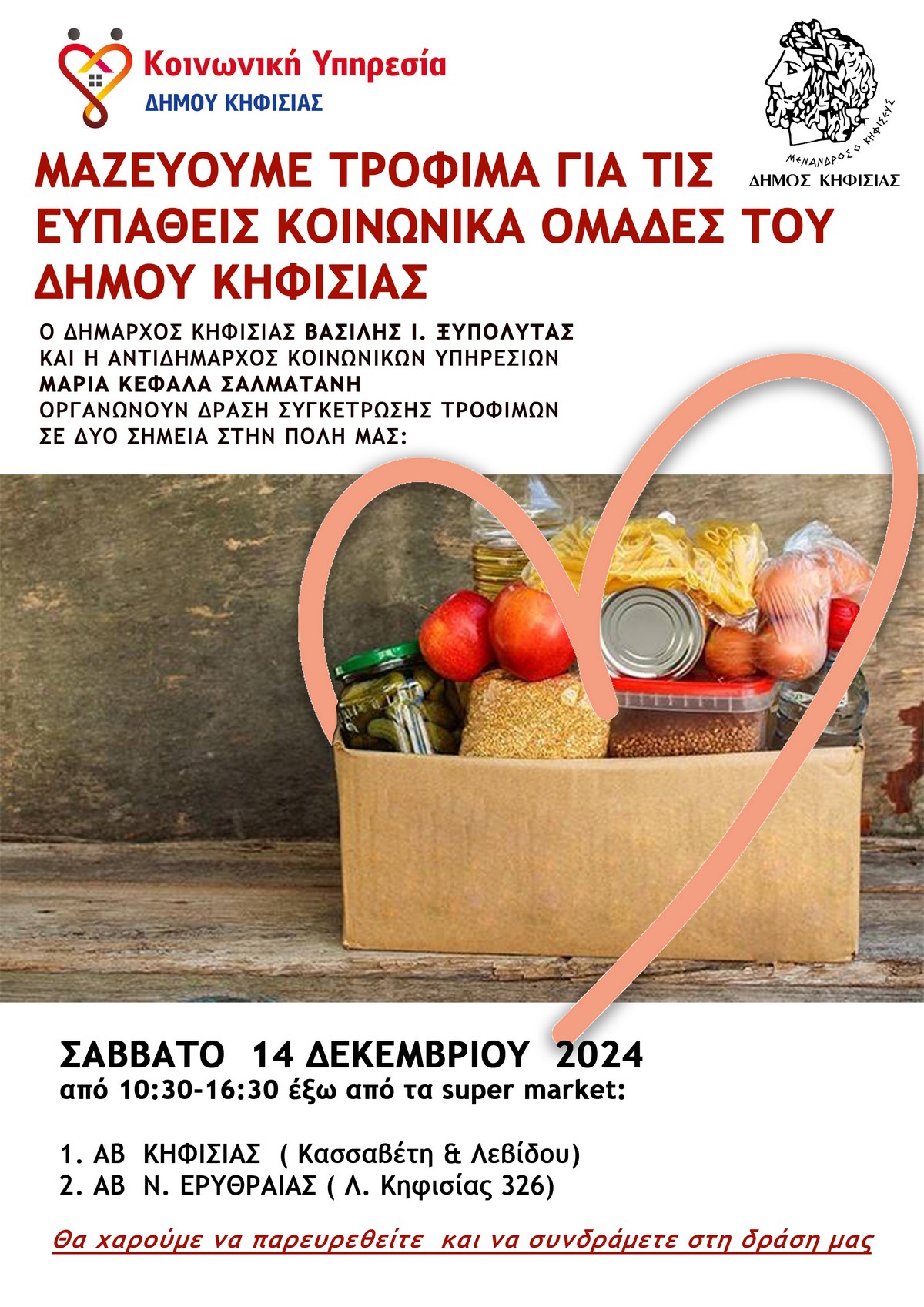 Η Κοινωνική Υπηρεσία του Δήμου Κηφισιάς, κάθε χρόνο ενόψει των εορτών των Χριστουγέννων, υλοποιεί δράσεις συλλογής τροφίμων σε Κηφισιά & Ερυθραία, για την ενίσχυση των Κοινωνικών μας Παντοπωλείων.