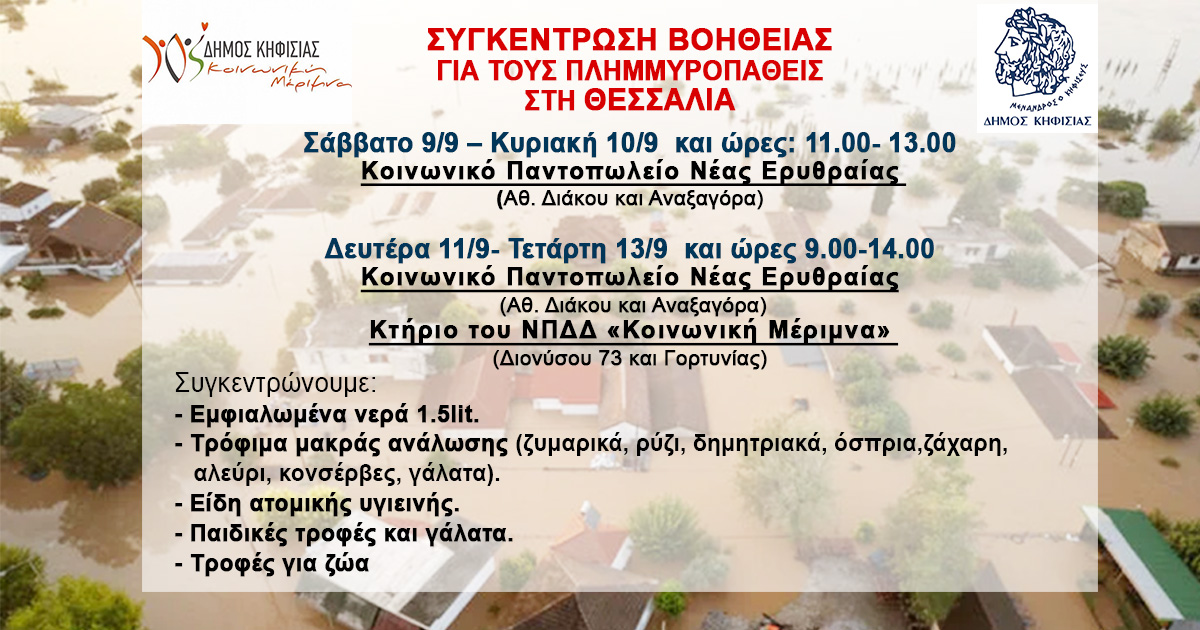 Ο Δήμος Κηφισιάς στέκεται στο πλευρό των πλημμυροπαθών της Θεσσαλίας, οι οποίοι επλήγησαν από την κακοκαιρία, και καλεί τους πολίτες σε συγκέντρωση ανθρωπιστικής βοήθειας.