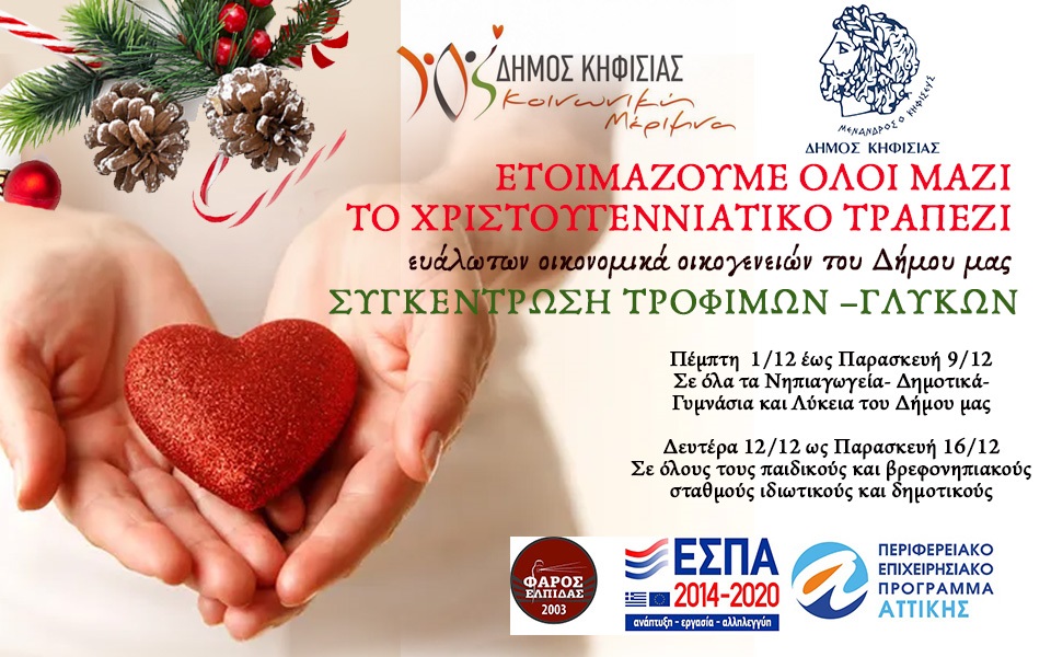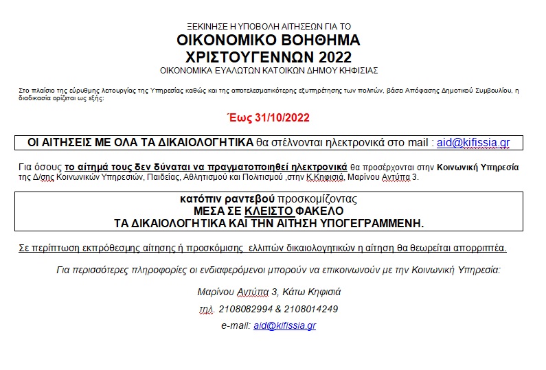 Στο πλευρό των πολιτών που αντιμετωπίζουν οικονομικές δυσκολίες στέκεται και φέτος ο Δήμος Κηφισιάς με το επίδομα των Χριστουγέννων 2022, σύμφωνα με σχετική απόφαση του Δημοτικού Συμβουλίου Κηφισιάς.