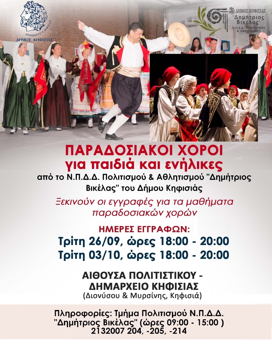 Ξεκινούν οι εγγραφές για τα μαθήματα παραδοσιακών χορών για παιδιά και ενήλικες από το Ν.Π.Δ.Δ. Πολιτισμού & Αθλητισμού "Δημήτριος Βικέλας" του Δήμου Κηφισιάς
