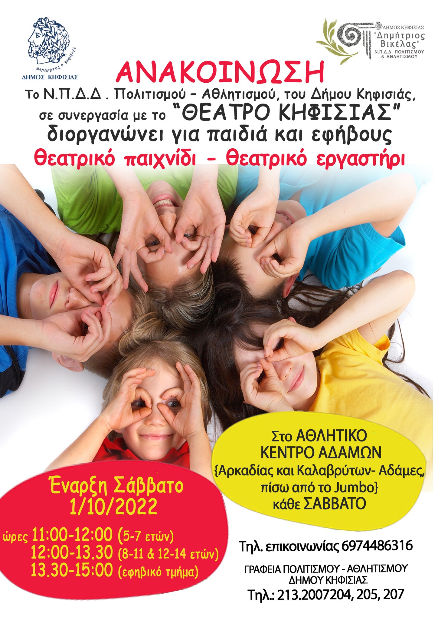 Το Ν.Π.Δ.Δ. Πολιτισμού & Αθλητισμού "Δημήτριος Βικέλας" του Δήμου Κηφισιάς, σε συνεργασία με το “ΘΕΑΤΡΟ ΚΗΦΙΣΙΑΣ” διοργανώνει για παιδιά και εφήβους θεατρικό παιχνίδι - θεατρικό εργαστήρι.