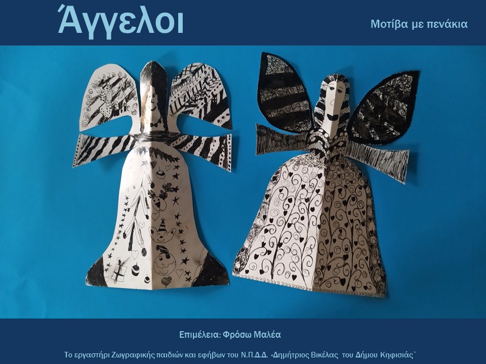 Η Φρόσω Μαλέα, δασκάλα του εργαστηρίου ζωγραφικής παιδιών και εφήβων του Ν.Π.Δ.Δ. Πολιτισμού & Αθλητισμού «Δημήτριος Βικέλας» του Δήμου Κηφισιάς, προτείνει στα παιδιά να δημιουργήσουν αγγέλους από χαρτί και να τους διακοσμήσουν με διαφορετικά μοτίβα.