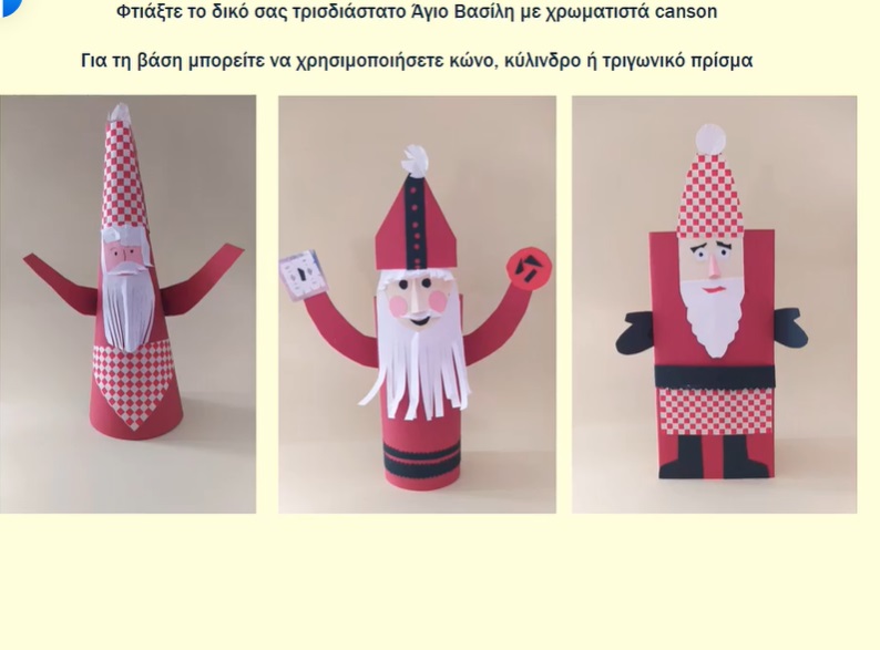 Η Φρόσω Μαλέα, δασκάλα του εργαστηρίου ζωγραφικής παιδιών και εφήβων του Ν.Π.Δ.Δ. Πολιτισμού & Αθλητισμού «Δημήτριος Βικέλας» του Δήμου Κηφισιάς, προτείνει στα παιδιά να φτιάξουν τον δικό τους τρισδιάστατο Άγιο Βασίλη από χρωματιστό χαρτί canson.