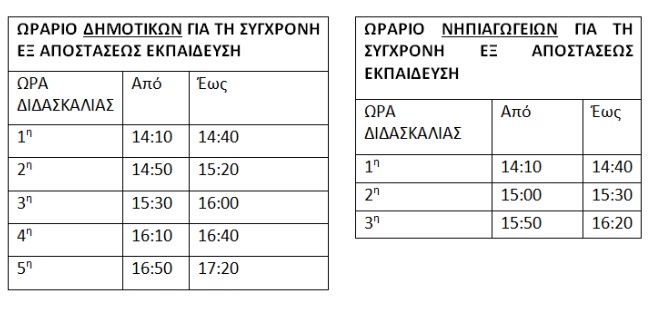 Η τηλεκπαίδευση θα ξεκινήσει την Τετάρτη, μετά τη σχολική αργία της 17ης Νοεμβρίου. Θα είναι υποχρεωτική, η κάθε διδακτική ώρα θα έχει διάρκεια 30’ και θα πραγματοποιείται από τις 2 έως τις 5 μ.μ. για τα δημοτικά, και από τις 2 έως τις 4:20 μ.μ. για τα νηπιαγωγεία, συμπεριλαμβανομένων σύντομων διαλειμμάτων.