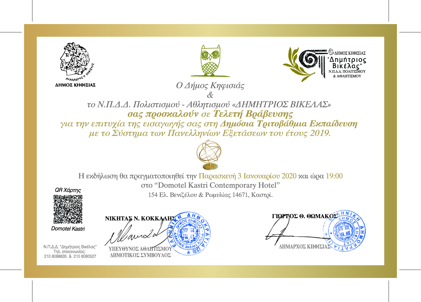 Την βράβευση 240 πρωτοετών Φοιτητών και Φοιτητριών στην Δημόσια Γ΄βάθμια Εκπαίδευση από τα Λύκεια της πόλης μας πραγματοποίησε το Ν.Δ.Δ.Δ. Πολιτισμού και Αθλητισμού«ΔΗΜΗΤΡΙΟΣ ΒΙΚΕΛΑΣ» του ΔΗΜΟΥ ΚΗΦΙΣΙΑΣ στις 3/1/2020 στο Ξενοδοχείο Domotel Kastri.