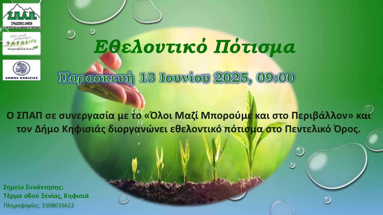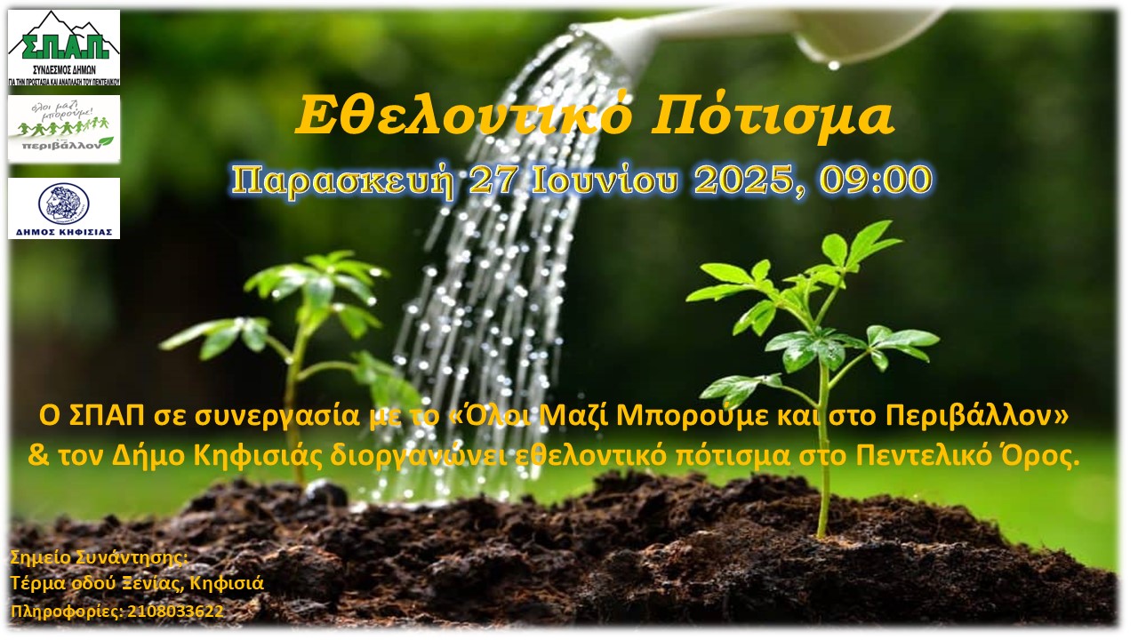 Με την συμμετοχή εργαζομένων, εθελοντών και αιρετών, πραγματοποιήθηκε σήμερα Παρασκευή 27 Ιουνίου, Εθελοντικό Πότισμα, από το Σύνδεσμο Δήμων για την Προστασία και Ανάπλαση του Πεντελικού (ΣΠΑΠ) σε συνεργασία με τον Δήμο Κηφισιάς και το «Όλοι Μαζί Μπορούμε και στο Περιβάλλον» και στον Κοκκιναρά Κηφισιάς, στην περιοχή που αναδασώθηκε κατά τη φυτευτική περίοδο 2024 2025.
