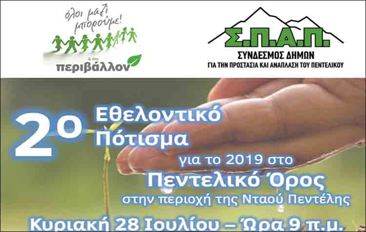 Ο Σύνδεσμος Δήμων για την Προστασία και Ανάπλαση του Πεντελικού (ΣΠΑΠ) συνεχίζοντας την προσπάθεια για την όσο το δυνατόν καλύτερη αποκατάσταση του φυσικού περιβάλλοντος στο Πεντελικό όρος, διοργανώνει την Κυριακή 28 Ιουλίου 2019 και ώρα 9 π.μ το 2ο Εθελοντικό Πότισμα 2019 στις περιοχές που αναδασώθηκαν τον περασμένο χειμώνα, στην Νταού Πεντέλης, σε συνεργασία με το Δήμο Κηφισιάς και το «Όλοι Μαζί Μπορούμε και στο Περιβάλλον».