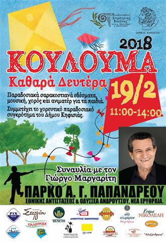 Ο Δήμος Κηφισιάς και το Ν.Π.Δ.Δ. Πολιτισμού & Αθλητισμού «Δημήτριος Βικέλας» οργανώνουν εκδήλωση για να εορταστούν τα Κούλουμα, την Καθαρά Δευτέρα 19 Φεβρουαρίου 2018 και ώρα 11:00 -14:00 στο Πάρκο Ανδρέα Παπανδρέου (Εθνικής Αντιστάσεως & Οδυσσέα Ανδρούτσου) στη Νέα Ερυθραία.