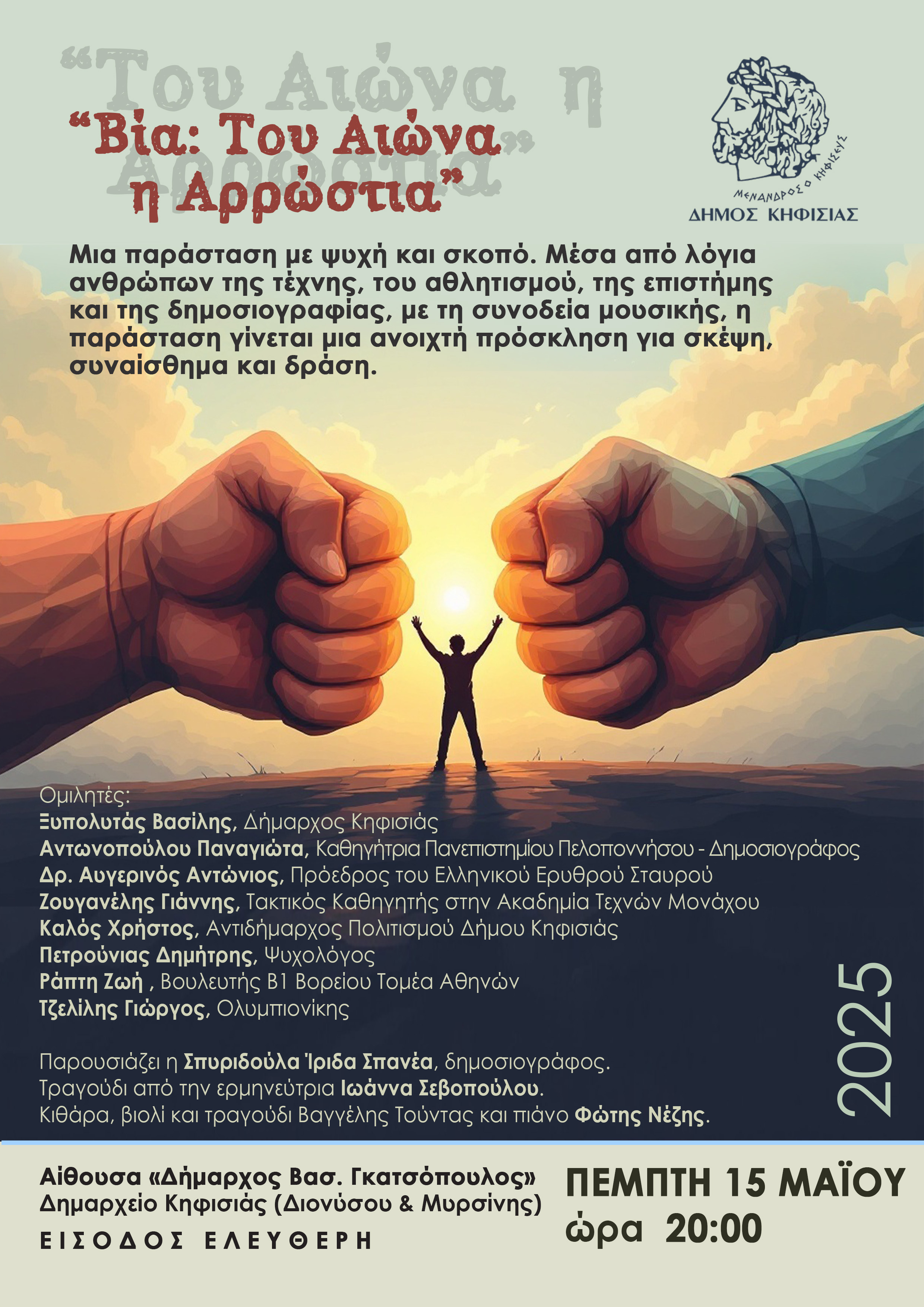 Ο Δήμος Κηφισιάς θα διοργανώσει στις 15 Μαΐου (20.00) εκδήλωση με θέμα «Βία: Του Αιώνα η Αρρώστια» στην αίθουσα "Β. Γκατσόπουλος" του Δημαρχείου (Διονύσου & Μυρσίνης 2), με ελεύθερη είσοδο για το κοινό.