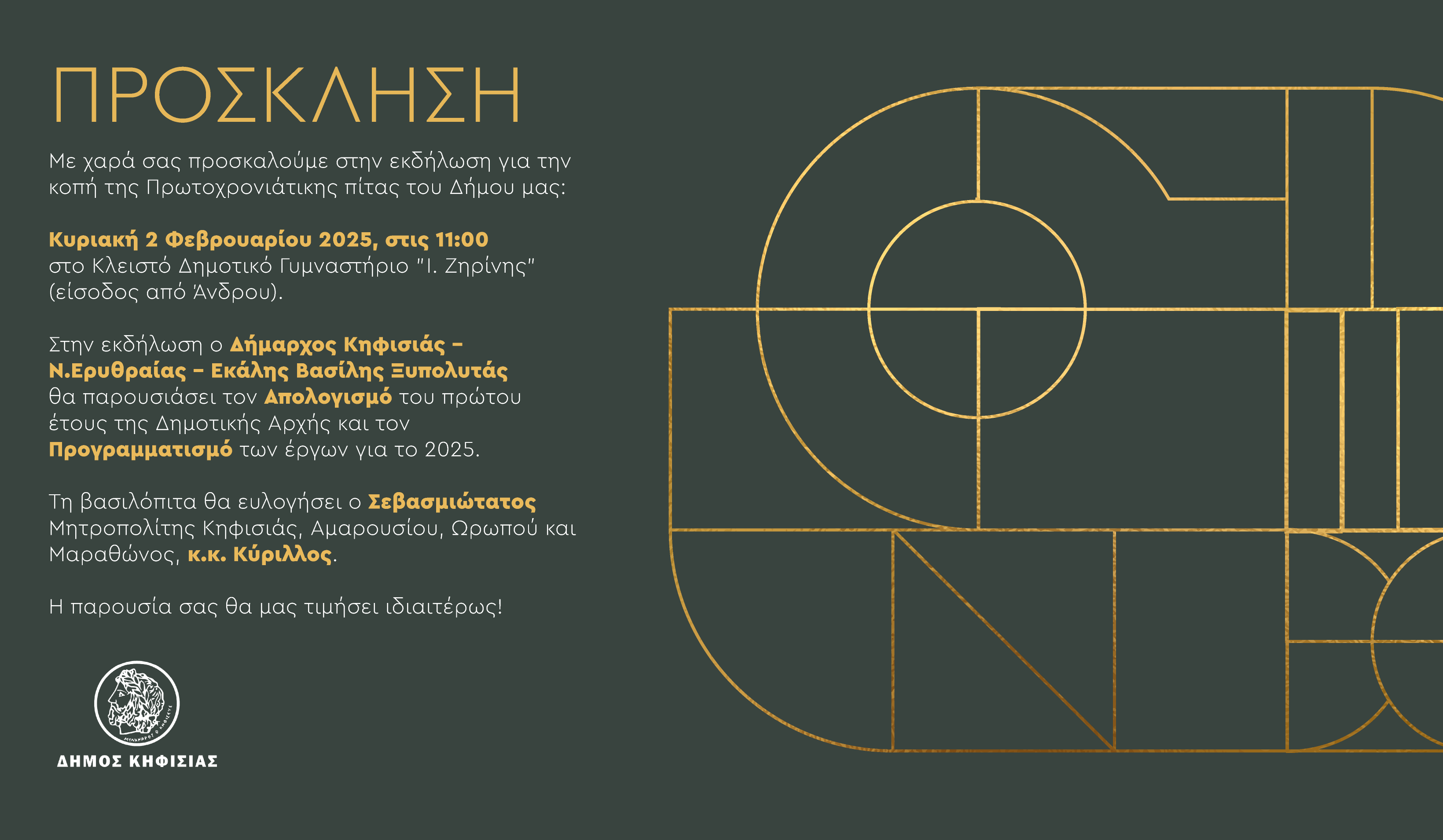 Σας προσκαλούμε να μας τιμήσετε με τη παρουσία σας στην κοπή της πρωτοχρονιάτικης πίτας του Δήμου μας, την Κυριακή, 2 Φεβρουαρίου 2025, στις 11.00 π.μ., στο Κλειστό Δημοτικό Γυμναστήριο “Ι. Ζηρίνης“ (είσοδος από Άνδρου).