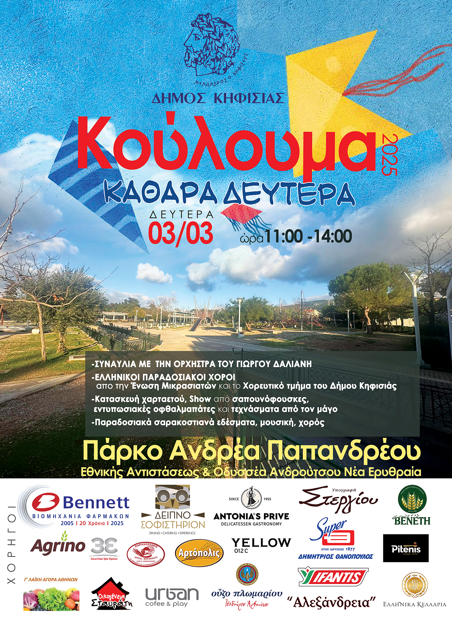 Για άλλη μια χρονιά ο Δήμος Κηφισιάς γιορτάζει τα "Κούλουμα" με παραδοσιακό γλέντι, σαρακοστιανά εδέσματα και εκπλήξεις για τα παιδιά την Καθαρά Δευτέρα, 3 Μαρτίου από τις 11-14.00 στο Πάρκο "Ανδρέα Παπανδρέου" (Εθνικής Αντιστάσεως & Οδυσσέα Ανδρούτσου), στη Νέα Ερυθραία.