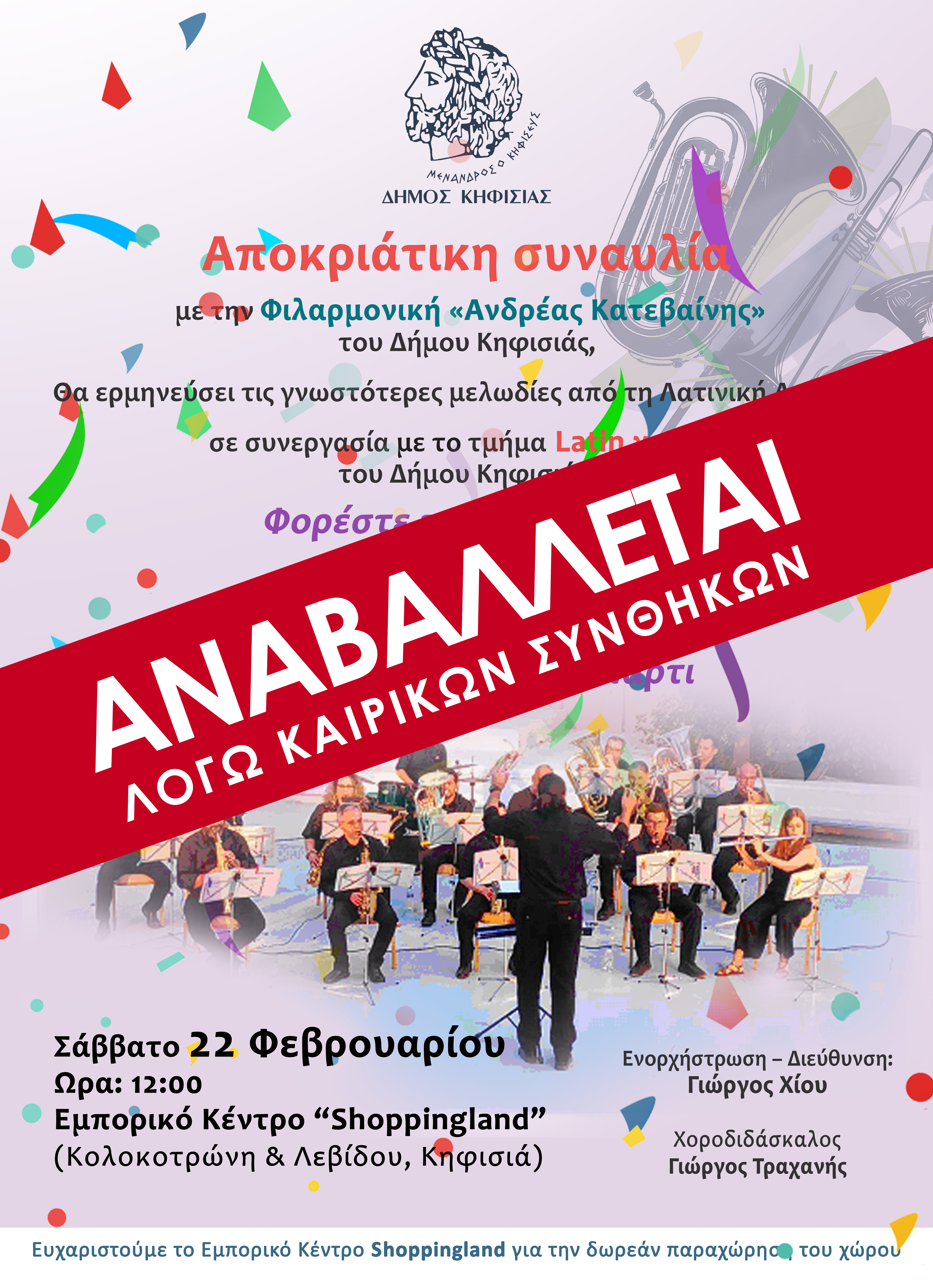 Λόγω δυσμενών καιρικών συνθηκών αναβάλλεται η προγραμματισμένη για το Σάββατο 22 Φεβρουαρίου, στις 12.00 εορταστική εκδήλωση "Αποκριάτικη Συναυλία και Latin Χοροί" του Δήμου Κηφισιάς στο Εμπορικό Κέντρο “Shoppingland”(Κολοκοτρώνη & Λεβίδου, Κηφισιά).