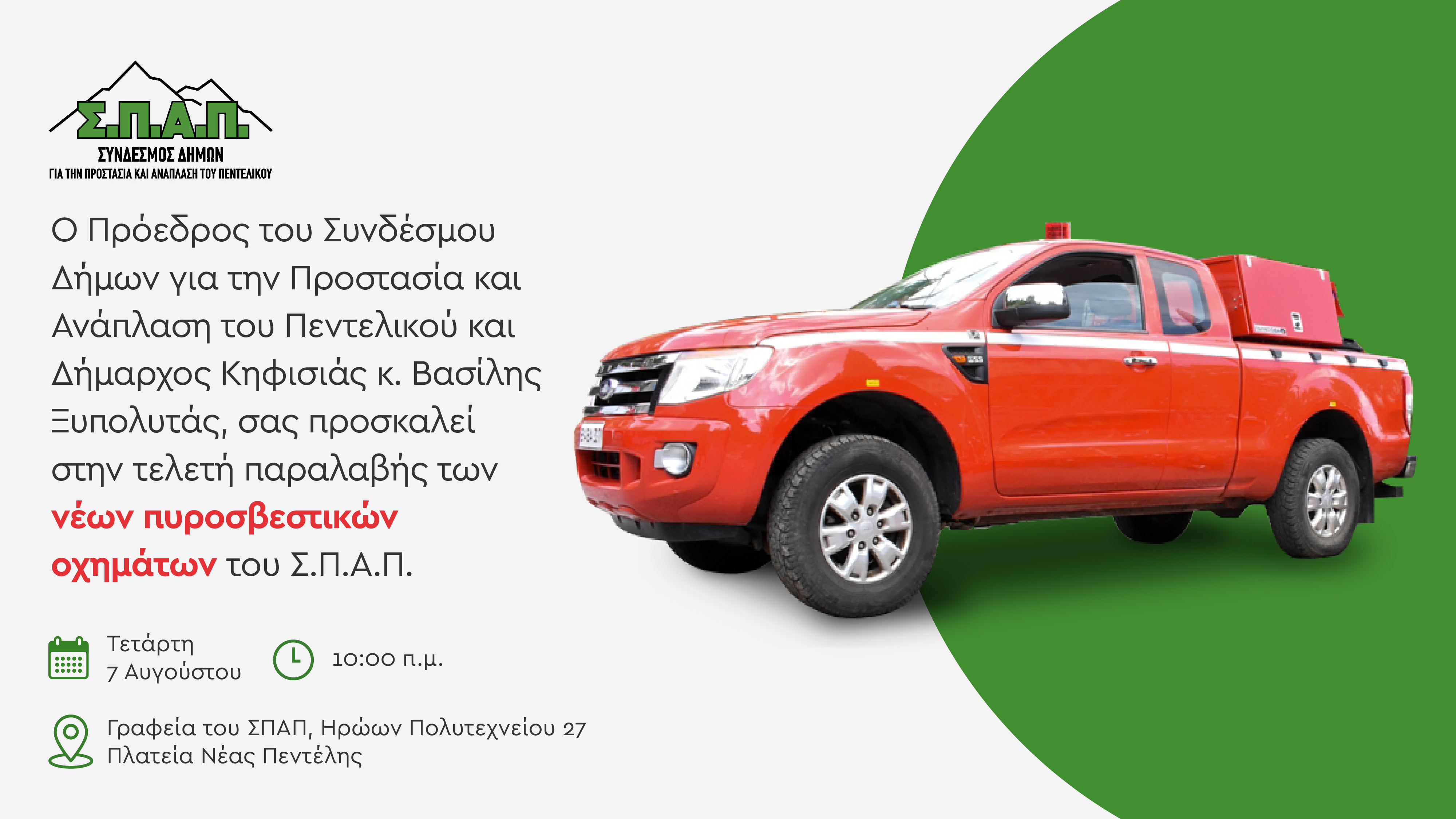 O  Δήμαρχος Κηφισιάς και Πρόεδρος του Συνδέσμου Δήμων για την Προστασία και Ανάπλαση του Πεντελικού κ. Βασίλης Ξυπολυτάς, σας προσκαλεί στην τελετή παραλαβής των νέων πυροσβεστικών οχημάτων του Σ.Π.Α.Π.