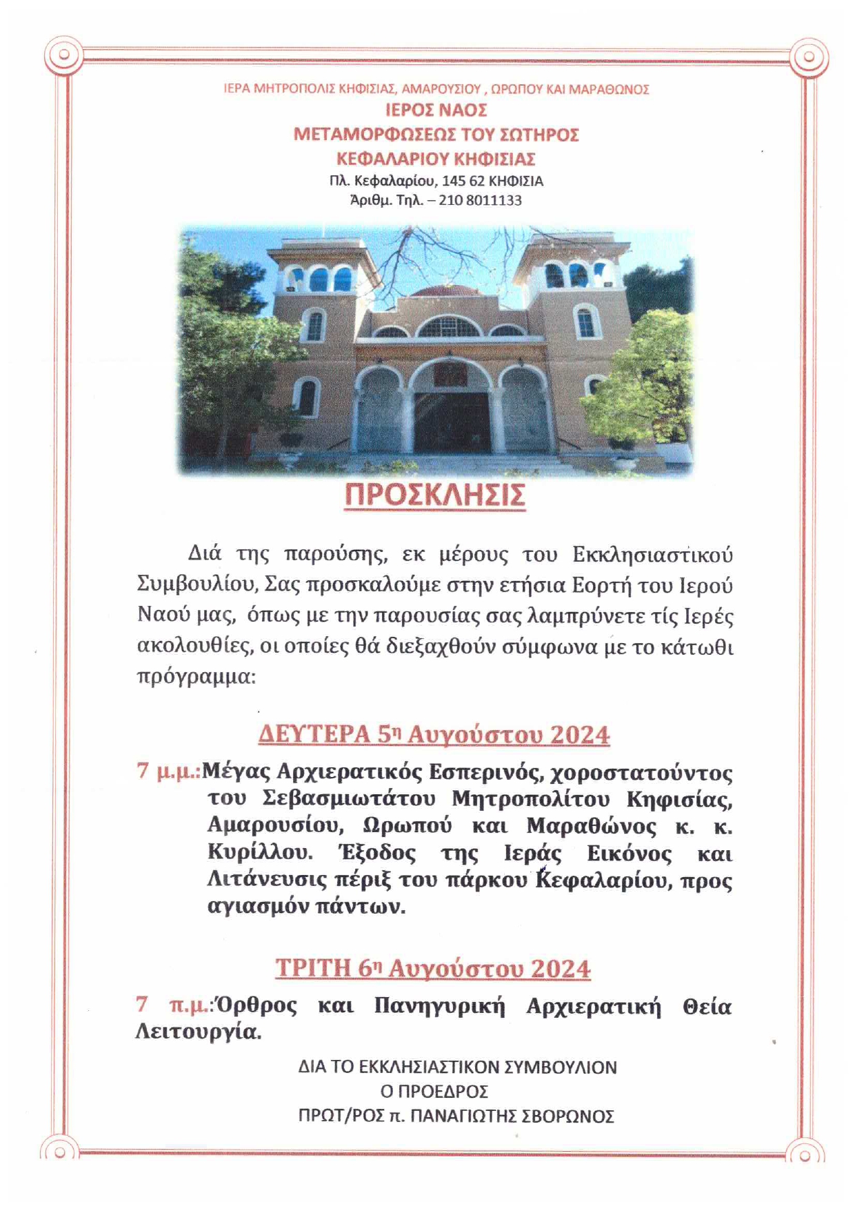 Την Πέμπτη 22 Αυγούστου 2024 στις 7.15 μ.μ. θα τελεστεί στο Ιερό Παρεκκλήσιο της Ενορίας Αγίου Δημητρίου Κηφισιάς «Παναγίτσα» (Πλατεία Πλατάνου), με τη συμμετοχή της Δημοτικής Αρχής, ο Μέγας Πανηγυρικός Εσπερινός, χοροστατούντος του Σεβασμιωτάτου Μητροπολίτου Κηφισιάς, Αμαρουσίου, Ωρωπού και Μαραθώνος κ. Κυρίλλου.